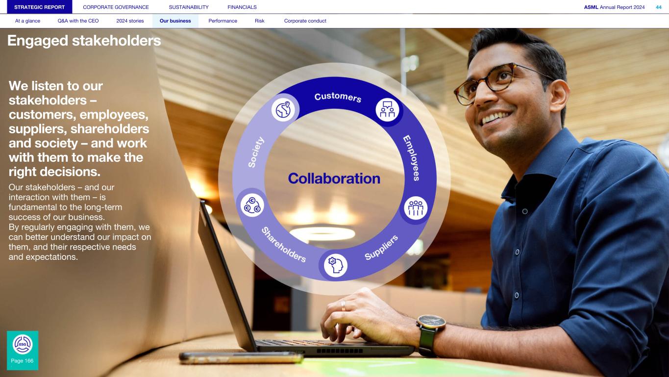 我们倾听我们的利益相关者——客户、员工、供应商、股东和社会——并与他们一起做出正确的决定。我们的利益相关者——以及我们与他们的互动——是我们业务长期成功的基础。通过定期与他们接触,我们可以更好地了解我们对他们的影响,以及他们各自的需求和期望。第166页>战略报告公司治理可持续发展财务ASML 2024年度报告44一览与CEO的问答2024故事我们的业务绩效风险公司行为参与的利益相关者