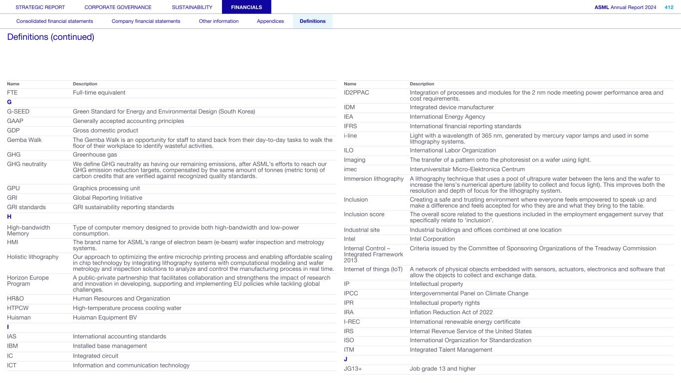 FTE全职等效G G-SEED绿色标准能源与环境设计(韩国)GAAP公认会计原则GDP国内生产总值Gemba Walk Gemba Walk是员工从日常工作中退后的机会,可以在工作场所的地板上走动,找出浪费的活动。ASML努力达到我们的GHG减排目标之后,我们将TERM3定义为:在我们的剩余排放量达到我们的TERM4减排目标之后,通过根据公认的质量标准进行验证的相同数量的吨(公吨)碳信用额来补偿,我们将对GHG进行中性定义。GPU图形处理单元GRI全球报告倡议GRI标准GRI可持续性报告标准H高带宽内存类型的计算机内存,旨在提供高带宽和低功耗。HMI ASML系列电子束(e-beam)晶圆检测和计量系统的品牌名称。整体光刻我们通过将光刻系统与计算建模以及晶圆计量和检测解决方案集成以实时分析和控制制造过程,优化整个微芯片打印过程并实现芯片技术中经济实惠的缩放的方法。Horizon Europe Program一种公私伙伴关系,可促进协作并加强研究和创新在制定、支持和实施欧盟政策方面的影响,同时应对全球挑战。HR & O人力资源和组织HTPCW高温工艺冷却水Huisman Huisman Equipment BV I IAS国际会计准则IBM安装底座管理IC集成电路ICT信息和通信技术名称说明ID2PPAC集成工艺和模块,用于满足功率性能区域和成本要求的2nm节点。IDM集成器件制造商IEA国际能源署IFRS国际财务报告标准i-line Light波长为365nm,由汞蒸气灯产生,用于一些光刻系统。ILO国际劳工组织使用光对晶圆上的光刻胶上的图案转移进行成像。IMEC Interuniversitair Micro-Elektronica Centrum 浸入科技光刻一种光刻技术,该技术使用镜头和晶圆之间的超纯水池来增加镜头的数值孔径(收集和聚焦光的能力)。这提高了光刻系统的分辨率和聚焦深度。包容创造一个安全和信任的环境,让每个人都感到有能力发声并有所作为,并对自己是谁以及他们带来的东西感到被接受。纳入评分与就业敬业度调查中包含的与‘纳入’具体相关的问题相关的总分。工业现场工业建筑物和办公室在一个地点结合在一起英特尔英特尔公司内部控制– Integrated Framework 2013标准由Treadway Commission物联网(IoT)发起组织委员会发布嵌入传感器、执行器、电子设备和软件的物理对象网络,允许对象收集和交换数据。IP知识产权IPCC政府间气候变化专门委员会IPR知识产权IRA 2022年通胀削减法案I-REC国际可再生能源证书IRS美国国税局ISO国际标准化组织ITM综合人才管理J JG13 +岗位13级及以上名称说明战略报告公司治理可持续发展金融丨ASML 2024年度报告412合并财务报表公司财务报表其他信息附录定义(续)