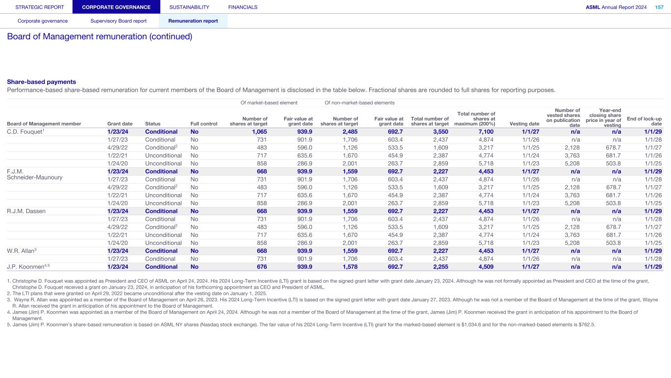 下表披露了管理委员会现任成员基于业绩的股份薪酬。零碎股份四舍五入为完整股份,以供报告之用。市场基础要素非市场基础要素董事会授予日状态完全控制授予日目标公允价值的股份数量授予日目标公允价值的股份数量目标股份总数最高股份总数(200%)归属日归属日归属股数公布日归属当年年终收盘股价锁定期结束日C.D. Fouquet1 1/23/24条件号1,065939.92,485692.73,5507,1001/1/27 n/a n/a 1/1/291/27/23条件号731901.91,706603.42,4374,8741/1/26 n/a n/a 1/284/29/22条件2否483596.01,126533.51,6093,2171/1/252,128678.71/1/271/22/21无条件号717635.61,670454.92,3874,7741/1/243,763681.71/1/261/24/20无条件号858286.92,001263.72,8595,7181/1/235,208503.81/1/25 F.J.M. Schneider-Maunoury 1/23/24条件号668939.91,559692.72,2274,4531/1/27 n/a n/a 1/291/27/23条件号731901.91,706603.42,4374,8741/1/26 n/a n/a 1/284/29/22条件1/1/235,208503.81/1/25 R.J.M. Dassen 1/23/24条件号668939.91,559692.72,2274,4531/1/27 n/a 1/291/27/23条件号731901.91,706603.42,4374,8741/1/26 n/a n/a 1/284/29/22条件号2否483596.01,126533.51,6093,2171/1/252,128678.71/271/22/21无条件号717635.61,670454.92,3874,7741/243,763681.71/1/26 1/24/20无条件号858286.92,001263.72,8595,7181/J.P. Koonmen4,51/23/24有条件编号676939.91,578692.72,2554,5091/1/27 n/a n/a 1/1/291。Christophe D. Fouquet于2024年4月24日被任命为ASML总裁兼首席执行官。他的2024年长期激励(LTI)授予基于签署的授予书,授予日期为2024年1月23日。尽管在获得赠款时并未被正式任命为总裁兼首席执行官,但Christophe D. Fouquet于2024年1月23日收到了赠款,预计他即将被任命为ASML的首席执行官兼总裁。2.于2022年4月29日授出的LTI计划于2025年1月1日归属日期后成为无条件。3.Wayne R. Allan于2023年4月26日被任命为管理委员会成员。他的2024年长期激励(LTI)基于已签署的授予书,授予日期为2023年1月27日。尽管在获得赠款时他还不是管理委员会的成员,但Wayne R. Allan收到了这笔赠款,因为他预计将被任命为管理委员会成员。4. James(Jim)P. Koonmen于2024年4月24日被任命为管理委员会成员。尽管在获得赠款时他还不是管理委员会的成员,但James(Jim)P. Koonmen收到了这笔赠款,预计他将被任命为管理委员会成员。5.James(Jim)P. Koonmen以股票为基础的薪酬以ASML NY shares(纳斯达克证券交易所)为基础。他的2024年长期激励(LTI)赠款的公允价值为1034.6美元,非标记部分为762.5美元。战略报告公司治理可持续发展财务ASML年度报告2024383合并财务报表公司财务报表其他信息附录定义合并财务报表附注(续)
