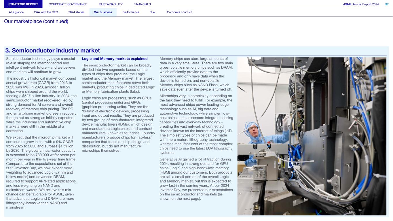 3.半导体行业市场半导体技术在塑造互联和智能网络的未来方面发挥着至关重要的作用——我们相信终端市场将继续增长。2013-2023年行业历史市场年复合增长率(CAGR)为6%。2023年,全球出货了近1万亿颗芯片,养活了一个价值5270亿美元的产业。2024年半导体市场复苏,AI服务器需求强劲、存储芯片定价整体回暖引领。个人电脑和智能手机市场确实出现了复苏,尽管没有最初预期的那么强劲,而工业和汽车芯片市场仍处于调整之中。我们预计,2025-2030年,微芯片市场将继续以9%的复合年增长率增长,到2030年将超过1万亿美元。全球年晶圆产能预计在这五年的时间框架内,每年每月将有78万片晶圆开工。与2022年投资者日设定的预期相比,我们现在预计更多的权重将放在支持AI相关应用所需的先进逻辑(≤ 7nm及以下节点)和先进DRAM上,而对NAND和主流晶圆的权重将减少。我们认为这种组合变化可能对ASML有利,因为先进的Logic和DRAM比NAND和主流更需要光刻技术。Logic和Memory市场解释称,根据半导体市场生产的芯片类型,半导体市场可以大致分为两个部分:Logic市场和Memory市场。最大的半导体制造商服务于这两个市场,在专用的Logic或Memory制造厂(晶圆厂)生产芯片。逻辑芯片是处理器,例如CPU(中央处理器)和GPU(图形处理器)。它们是电子设备的‘大脑’,处理输入和输出结果。它们由两组制造商生产:集成器件制造商(IDM),设计和制造Logic芯片;和合同制造商,称为代工厂。代工制造商为专注于芯片设计和分销的‘无晶圆厂’公司生产芯片,但自己并不制造微芯片。存储芯片可以在非常小的区域存储大量数据。主要有两种类型:DRAM等易失性存储芯片,高效地向处理器提供数据,仅在设备开启时才保存数据;以及NAND Flash等非易失性存储芯片,即使在设备关闭后也能保存数据。微芯片的复杂程度取决于它们需要完成的任务。例如,最先进的芯片为人工智能、大数据和汽车技术等领先技术提供动力,而传感器等更简单、低成本的芯片则将传感能力整合到日常技术中——创造了被称为物联网(LOT)的庞大联网设备网络。最简单类型的芯片可以用更成熟的光刻技术制造,而最复杂芯片的制造商则需要使用最新的EUV光刻系统。生成式AI在2024年期间获得了很大的牵引力,导致我们的客户对GPU芯片(Logic)和高带宽内存(HBM)的需求强劲。这两款产品在整体逻辑和内存市场中仍占一小部分,但预计这将在未来几年快速增长。在2024年投资者日上,我们提出了对半导体终端市场的预期(如下一页所示)。战略报告公司治理可持续发展财务ASML年度报告2024 37与CEO的一览问答2024故事我们的业务绩效风险公司行为我们的市场(续)