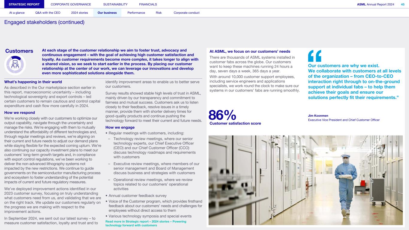 客户在客户关系的每个阶段,我们的目标是促进信任、倡导和持续参与——目标是实现高客户满意度和忠诚度。随着客户要求变得更加复杂,与共同愿景保持一致需要更长的时间,因此我们寻求在此过程中更早开始。通过将我们的客户关系置于我们工作的中心,我们可以利用我们的创新,并与它们一起开发更复杂的解决方案。正如本报告前面的Our marketplace部分所述,宏观经济的不确定性——包括技术主权和出口管制——导致某些客户保持谨慎,并在2024年更谨慎地控制资本支出和现金流。我们如何应对我们正在与客户密切合作,以优化我们的输出能力,在不确定性中导航并管理风险。我们正在与他们接触,以相互了解不同技术的可负担性,并通过定期会议和审查,根据他们当前和未来的需求调整我们的需求计划,同时为预期即将到来的好转保持灵活性。我们还在继续我们的产能投资计划,以实现客户的长期增长目标,并且根据出口管制规定,我们一直在努力交付不受新限制影响的非先进光刻系统。我们继续在半导体制造工艺和生态系统方面指导各国政府,以促进对当前和未来监管措施的潜在影响的理解。我们部署了2023年客户调查中确定的改进行动,重点是真正了解客户对我们的需求,并验证我们走在正确的轨道上。我们定期向客户更新我们在改进行动方面取得的进展。2024年9月,我们发出了最新调查——衡量客户满意度、忠诚度和信任度,并确定改进领域,使我们能够更好地为客户服务。调查结果显示,人们对ASML的信任度稳定在较高水平,这主要是由我们的透明度以及对公平和共同成功的承诺所驱动。客户要求我们认真听取他们的反馈,及时解决问题,为他们提供更短的优质产品交付时间,并不断推动技术向前发展,以满足他们当前和未来的需求。我们如何参与•与客户的定期会议,包括:–技术审查会议,我们的高级技术专家、我们的首席执行官(CEO)和我们的首席客户官(CCO)与客户讨论技术路线图和要求–执行审查会议,我们的高级管理层和管理委员会成员与客户讨论业务和战略–运营审查会议,我们在其中审查与客户的运营活动相关的主题•年度客户反馈调查•客户之声计划,为无法直接接触到员工的员工提供有关客户需求和挑战的第一手反馈•各种技术研讨会和特别活动在战略报告中阅读更多内容– 2024故事–与客户一起推动技术向前发展战略报告公司治理可持续发展财务ASML年度报告202445与CEO的问答一目了然2024故事我们的业务绩效风险公司行为与利益相关者(续)在ASML,我们专注于客户的需求全球各地的客户晶圆厂中安装了数千个ASML系统。我们的客户希望让这些机器保持一天24小时、一周七天、一年365天的运转。我们拥有大约10,000名客户支持员工,其中包括服务工程师和应用专家,我们全天候工作,以确保客户晶圆厂中的系统平稳运行。我们的客户是我们存在的原因。我们与组织各级客户合作——从CEO到CEO的互动一直到各个晶圆厂的实地支持——帮助他们实现目标,并确保我们的解决方案完全符合他们的要求。”86% Jim Koonmen执行副总裁兼首席客户官客户满意度得分