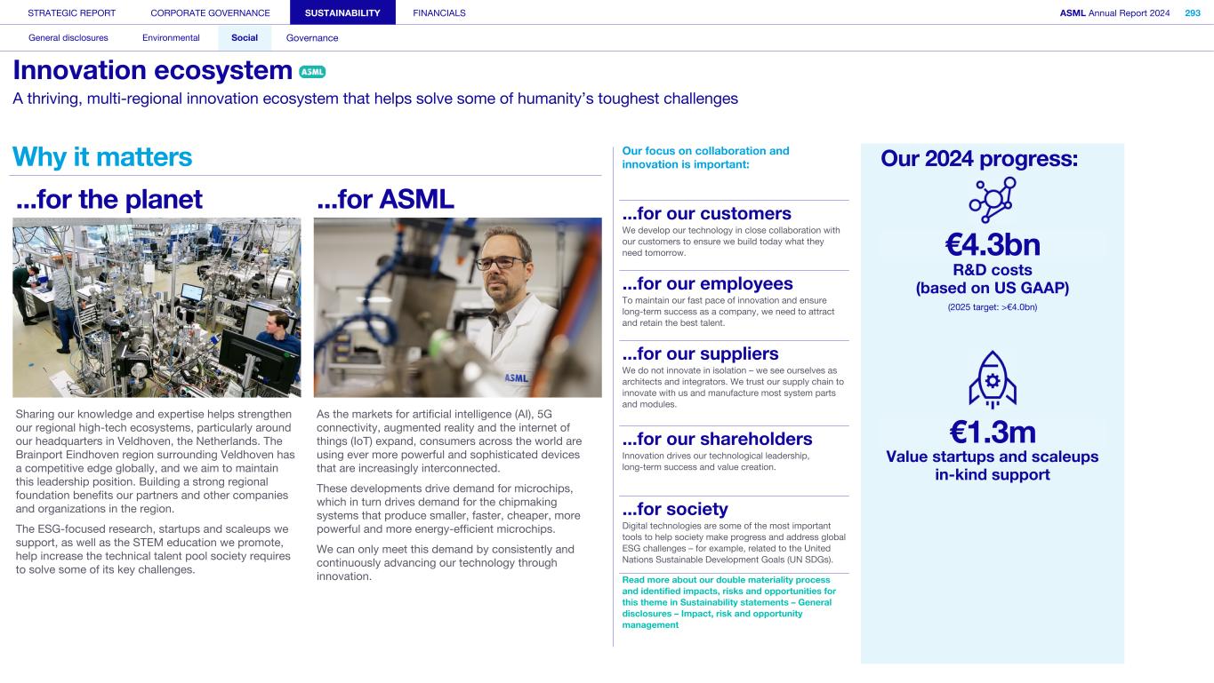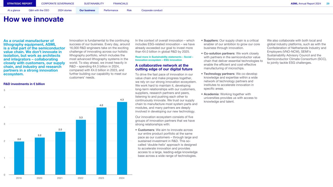 作为光刻设备的关键制造商,ASML是半导体价值链中至关重要的一环。我们不是孤立地进行创新,而是作为架构师和集成商——在强大的创新生态系统中与客户、我们的供应链以及行业和研究合作伙伴密切协作。亿欧元的研发投资2.0 2.2 2.5 3.34.04.32019202020212021202220232024012345创新是我们业务持续成功的基础。每天,约有16,000名研发工程师在我们的整体光刻产品组合中承担着令人兴奋的创新挑战,其中包括世界上最先进的光刻系统。为了保持领先,我们在研发方面进行了大量投资—— 2024年的支出为43亿欧元,而2023年为40亿欧元,并进一步建设我们满足客户需求的能力。在整体创新——包括ESG相关创新——的背景下,我们已经超额完成了到2025年在全球研发领域投资超过40亿欧元的目标。阅读更多可持续发展声明–社会–创新生态系统– ESG创新一个处于我们数字化未来前沿的协作网络要推动我们价值链中的快速创新步伐并共同进步,我们依赖于我们强大的创新生态系统。我们努力维护它,与我们的客户、供应商、研究伙伴和同行发展长期关系,倾听并推动彼此不断创新。我们信任我们的供应链来制造大部分系统零件和模块,许多合作伙伴都深度参与开发我们的新技术。我们的创新生态系统由五组与我们有密切关系的创新合作伙伴组成:•客户:我们的目标是在我们的整个产品组合中以与客户相同的速度进行创新——通过对研发的大量持续投资。这种所谓的‘双螺旋’方法旨在加速创新,并提供对广泛技术的大型领先知识库的访问。•供应商:我们的供应链是我们通过创新发展核心业务的雄心的关键推动因素。•协同解决方案合作伙伴:我们与半导体价值链中的合作伙伴密切合作,这些合作伙伴提供必要的技术,以实现高效且具有成本效益的微芯片制造。•技术合作伙伴:我们在广泛的技术合作伙伴和研究所网络内共同开发知识和专业知识,以加速特定领域的创新。•学术界:与大学合作为我们提供了获得知识和人才的机会。我们还与当地和全球行业平台合作,例如与荷兰工业和雇主联合会(VNO-NCW)、SEMI的可持续发展咨询委员会和半导体气候联盟(SCC)合作,共同应对ESG挑战。战略报告企业治理可持续发展财务ASML年度报告2024 29一览与CEO的问答2024故事我们的业务绩效风险企业行为我们如何创新