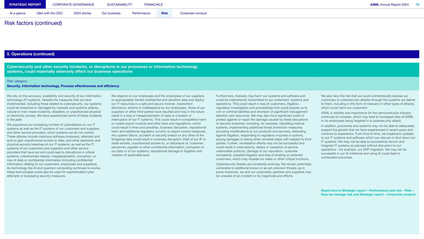 5.运营(续)网络安全和其他安全事件,或我们的流程或信息技术系统中断,可能会对我们的业务运营产生重大不利影响风险类别:安全、信息技术、流程有效性和效率我们依赖于我们的信息技术(IT)系统的准确性、可用性和安全性。尽管我们已经实施了包括网络安全相关措施在内的措施,但我们的系统可能会因恶意软件和系统攻击、自然或人为事件、灾难或未经授权的物理或电子访问而遭到破坏或破坏。我们过去经历过一些这样的事件。我们的IT系统以及客户、供应商和其他服务提供商的IT系统受到越来越多的网络攻击,而这些系统是我们无法控制的。这些攻击包括恶意软件(恶意软件)、试图和采取行动获取未经授权的数据访问权限,以及对我们IT系统的其他电子和物理安全漏洞,以及导致并可能导致关键系统中断、未经授权发布、盗用、腐败或数据或机密信息(包括与我们的客户、员工和供应商有关的机密信息)的客户和供应商和其他服务提供商的IT系统。随着人工智能和量子计算等技术不断发展,这些技术也可能被用于复杂的网络尝试或绕过安全措施。我们依赖我们的员工和供应商的员工适当处理机密和敏感数据,并以安全可靠的方式部署我们的IT资源。我们的员工、我们的供应商或其他第三方的员工的无意披露、行为或渎职行为已导致并可能在未来导致数据丢失或被盗用或我们的IT系统遭到破坏或中断。这可能导致竞争性损害或违反出口管制和其他法律法规,可能导致罚款和处罚、业务中断、声誉损害以及额外的监管审查或出口管制措施。任何系统故障、事故或安全漏洞或上述任何其他风险都可能导致业务中断、窃取我们的知识产权或商业秘密、未经授权访问或披露客户、人员、供应商或其他机密信息、损坏我们的数据或我们的系统、声誉受损或诉讼以及违反适用法律。此外,恶意软件可能会损害我们的系统和软件,并可能在无意中传播到我们客户的系统和运营中。这可能会导致客户流失、诉讼、监管调查和诉讼,从而使我们面临民事或刑事责任,并转移管理层的重要注意力和资源。我们还可能为防止或修复这些中断或安全漏洞造成的损害而承担大量费用,例如,包括重建内部系统、实施额外的威胁保护措施、对我们的产品和服务提供修改、抗辩诉讼、回应监管询问或行动、支付损害赔偿或就第三方采取其他补救措施。此外,补救努力可能不会成功,并可能导致服务中断、延迟或停止、不利的宣传、损害我们的声誉、客户投诉、可能的诉讼以及现有或潜在客户的损失,这可能会阻碍我们的销售或其他关键职能。网络安全威胁不断演变。我们仍然可能容易受到更多已知或迄今未知的威胁,因为在某些情况下,我们和我们的客户、合作伙伴和供应商可能不知道事件或其规模和影响。我们还面临这样的风险,即我们可能会通过我们交付给客户的系统无意中使客户面临网络安全攻击,包括以恶意软件或其他类型攻击的形式,这可能会损害我们的客户。ASML对半导体行业的知名度和重要性不断提高,这可能导致ASML或其员工成为网络安全攻击目标的风险增加。此外,流程和系统可能无法充分支持我们近年来经历并继续经历的增长。我们不时对我们的IT系统和软件实施更新,这可能会破坏或关闭我们的IT系统。我们可能无法在不中断我们的运营的情况下按计划成功启动和整合IT系统——例如, 我们的ERP迁移。我们的人工智能举措可能不会成功,使用人工智能可能会导致意想不到的结果。在战略报告中阅读更多内容–绩效和风险–风险–我们如何管理风险和战略报告–企业行为战略报告企业治理可持续性财务2024年75年度报告与首席执行官的一览问答2024故事我们的业务绩效风险企业行为风险因素(续)