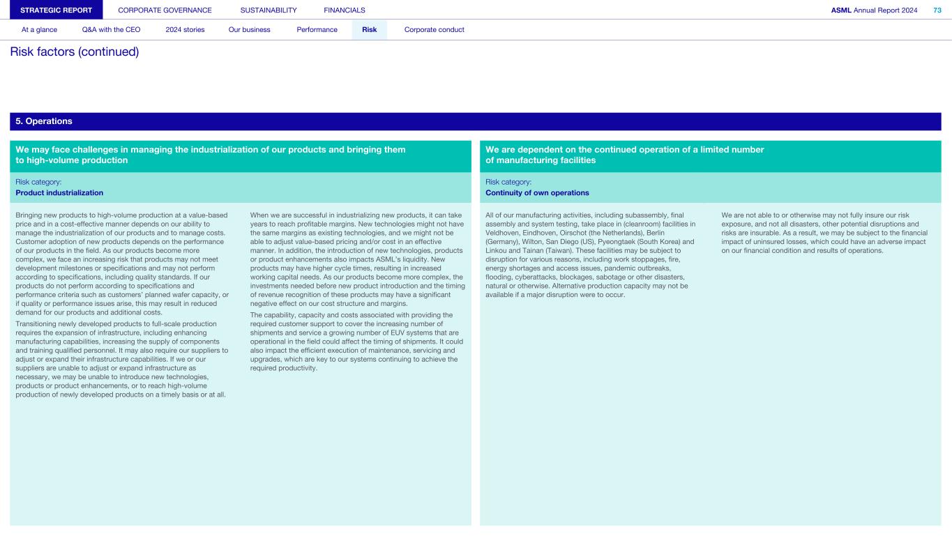 5.运营我们在管理我们产品的工业化并将其用于大批量生产方面可能面临挑战我们依赖于有限数量的制造设施的持续运营风险类别:风险类别:产品工业化自身运营的连续性以基于价值的价格和具有成本效益的方式将新产品用于大批量生产取决于我们管理我们产品的工业化和管理成本的能力。客户对新产品的采用取决于我们产品在该领域的表现。随着我们的产品变得更加复杂,我们面临越来越大的风险,即产品可能无法达到开发里程碑或规格,并且可能无法按照规格,包括质量标准执行。如果我们的产品没有按照客户计划的晶圆产能等规格和性能标准运行,或者出现质量或性能问题,这可能会导致对我们产品的需求减少和额外成本。将新开发的产品过渡到全面生产需要扩大基础设施,包括增强制造能力、增加组件供应和培训合格人员。它还可能要求我们的供应商调整或扩展其基础设施能力。如果我们或我们的供应商无法根据需要调整或扩展基础设施,我们可能无法引入新技术、产品或产品增强功能,或无法及时或根本无法达到新开发产品的大批量生产。当我们成功地将新产品产业化时,可能需要数年时间才能达到有利可图的利润率。新技术可能与现有技术的利润率不同,我们可能无法以有效的方式调整基于价值的定价和/或成本。此外,新技术、产品或产品增强功能的引入也会影响ASML的流动性。新产品可能有更高的周期时间,导致营运资金需求增加。随着我们的产品变得更加复杂,在推出新产品之前所需的投资以及这些产品的收入确认时间可能会对我们的成本结构和利润率产生显着的负面影响。与提供所需的客户支持相关的能力、能力和成本,以覆盖越来越多的出货量,并为越来越多在现场运行的EUV系统提供服务,这可能会影响发货时间。它还可能影响维护、服务和升级的高效执行,这是我们的系统继续实现所需生产力的关键。我们所有的制造活动,包括分装、总装和系统测试,都在Veldhoven、Eindhoven、Oirschot(荷兰)、Berlin(德国)、Wilton、San Diego(美国)、Pyeongtaek(韩国)以及Linkou和Tainan(台湾)的(洁净室)设施中进行。这些设施可能会因各种原因受到干扰,包括停工、火灾、能源短缺和准入问题、大流行病爆发、洪水、网络攻击、堵塞、破坏或其他灾害,无论是自然还是其他原因。如果发生重大中断,可能无法获得替代产能。我们无法或可能无法充分投保我们的风险敞口,并不是所有的灾难、其他潜在的中断和风险都是可以投保的。因此,我们可能会受到未投保损失的财务影响,这可能会对我们的财务状况和经营业绩产生不利影响。战略报告公司治理可持续发展财务ASML年度报告202473与CEO的一览问答2024故事我们的业务绩效风险公司行为风险因素(续)