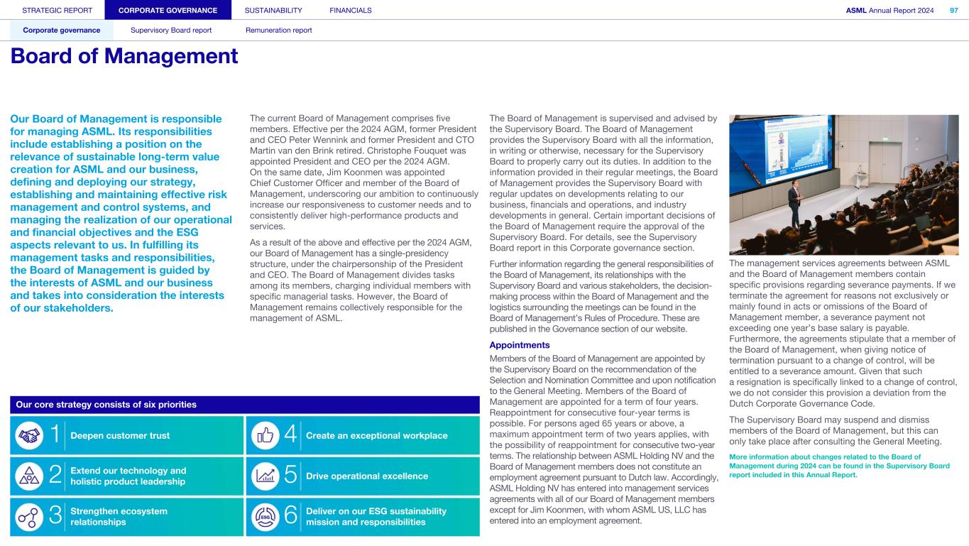我司管理委员会负责管理ASML。其职责包括就可持续长期价值创造对ASML与我们业务的相关性建立立场,定义和部署我们的战略,建立和维护有效的风险管控系统,以及管理我们运营和财务目标的实现以及与我们相关的ESG方面。在履行管理任务和责任时,管理董事会以ASML和我们业务的利益为指导,并考虑到我们利益相关者的利益。现任管理委员会由五名成员组成。根据2024年年度股东大会,前总裁兼首席执行官Peter Wennink和前总裁兼CTO Martin van den Brink退休。根据2024年年度股东大会,克里斯托夫·富凯被任命为总裁兼首席执行官。同日,Jim Koonmen被任命为首席客户官和管理委员会成员,这突显出我们不断提高对客户需求的响应能力并持续提供高性能产品和服务的雄心。由于上述原因,并根据2024年年度股东大会生效,我们的管理委员会采用单一主席结构,由总裁兼首席执行官担任主席。管理委员会在其成员之间划分任务,向个别成员收取具体的管理任务。但是,管理委员会仍然对ASML的管理集体负责。管理委员会由监事会监督和建议。管理委员会以书面或其他方式向监事会提供监事会适当履行职责所需的所有信息。除了在定期会议上提供的信息外,管理委员会还定期向监事会提供与我们的业务、财务和运营以及整个行业发展有关的最新情况。管理委员会的某些重要决定需要监事会的批准。详见本公司治理部分监事会报告。有关管理委员会的一般职责、其与监事会和各利益攸关方的关系、管理委员会内部的决策过程以及围绕会议的后勤工作的更多信息,可在管理委员会的议事规则中找到。这些都发布在我们网站的治理部分。任命管理委员会成员由监事会根据推选和提名委员会的推荐并在通知股东大会后任命。管理委员会成员任期四年。连任四年是可能的。65岁以上人员,最长任期两年,可连任两年。根据荷兰法律,阿斯麦 NV与管理委员会成员之间的关系不构成雇佣协议。据此,阿斯麦 NV已与我们的所有管理委员会成员订立管理服务协议,但Jim Koonmen除外,后者已与ASML US,LLC订立雇佣协议。ASML与管理委员会成员之间的管理服务协议包含有关遣散费的具体规定。如果我们终止协议的原因不完全是或主要是在管理委员会成员的作为或不作为中发现的,则应支付不超过一年基本工资的遣散费。此外,协议规定,管理委员会成员在根据控制权变更发出终止通知时,将有权获得遣散费。鉴于此类辞职具体与控制权变更有关,我们不认为这一规定偏离了荷兰公司治理准则。监事会可以暂停和解聘管理委员会成员,但这只能在征询股东大会意见后进行。有关2024年管理委员会相关变动的更多信息,请参阅本年度报告中包含的监事会报告。战略报告公司治理可持续发展金融公司ASML年度报告202497公司治理监事会报告薪酬报告管理委员会我们的核心战略包括六个优先事项1深化客户信任4创造卓越的工作场所2扩展我们的技术和整体产品领先地位5推动卓越运营3加强生态系统关系6履行我们的ESG可持续发展使命和责任