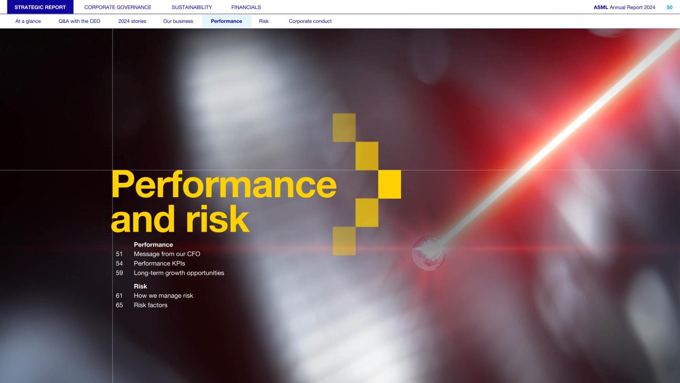 战略报告企业治理可持续发展金融学ASML年度报告202450一览与CEO的问答2024故事我们的业务绩效风险企业行为绩效和风险绩效51首席财务官的信息54绩效KPI 59长期增长机会风险61我们如何管理风险65风险因素