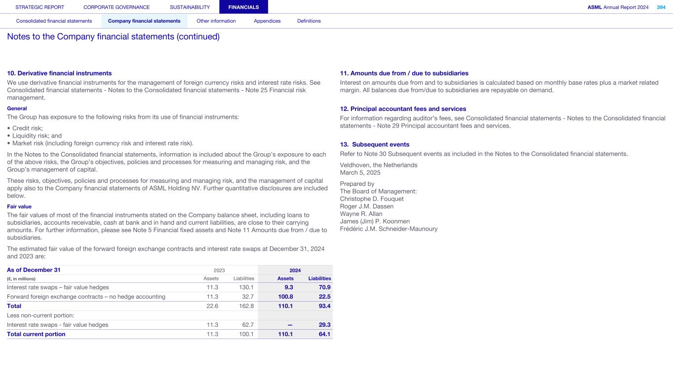 10.衍生金融工具我们将衍生金融工具用于外汇风险和利率风险的管理。见合并财务报表-合并财务报表附注-附注25财务风险管理。总体而言,本集团因使用金融工具而面临以下风险:•信用风险;•流动性风险;•市场风险(包括外汇风险和利率风险)。在综合财务报表附注中,载列了有关本集团面对上述每项风险的风险、本集团计量和管理风险的目标、政策和流程以及本集团对资本的管理的信息。这些衡量和管理风险以及资本管理的风险、目标、政策和流程也适用于阿斯麦 NV的公司财务报表。进一步的量化披露如下。公允价值公司资产负债表所列大部分金融工具的公允价值,包括对子公司的贷款、应收账款、银行及在手现金和流动负债,均接近其账面值。详情请见附注5金融固定资产及附注11应收/应付附属公司款项。2024年12月31日和2023年12月31日远期外汇合约和利率掉期的估计公允价值为:截至2023年12月31日2024年(欧元,百万)资产负债资产负债利率掉期–公允价值套期11.31 30.19.37 0.9远期外汇合约–无套期会计11.33 2.7 100.82 2.5合计22.6162.81 10.19 3.4减非流动部分:利率掉期-公允价值套期11.36 2.7 — 29.3流动部分合计11.3 100.11 10.16 4.111。应收/应付附属公司款项应收及应付附属公司款项的利息按月基率加上市场相关保证金计算。应收/应付附属公司的所有结余须按要求偿还。12.首席会计师费用和服务有关审计员费用的信息,请参见合并财务报表-合并财务报表附注-附注29首席会计师费用和服务。13.期后事项请参阅综合财务报表附注所载附注30期后事项。荷兰Veldhoven公司2025年3月5日由管理委员会编制:Christophe D. Fouquet Roger J.M. Dassen Wayne R. Allan James(Jim)P. Koonmen Fr é d é ric J.M. Schneider-Maunoury战略报告公司治理可持续发展财务丨ASML ASML年度报告2024394合并财务报表公司财务报表其他信息附录定义公司财务报表附注(续)