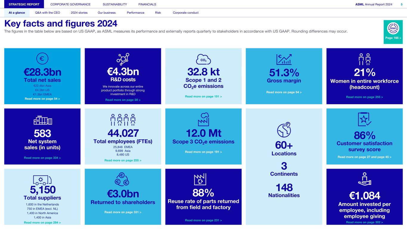 283亿欧元总净销售额224亿欧元亚洲45亿欧元13亿欧元欧洲、中东和非洲地区更多信息详见第54页> 583个系统净销售额(单位)详见第334页> 5,150个供应商总数1,600个在荷兰欧洲、中东和非洲地区750个(不包括NL)北美1,400亚洲1,400更多阅读第284页> 43亿欧元研发成本我们通过对研发的大力投资在整个产品组合中进行创新更多阅读第28页> 44027总员工(FTE)25,848欧洲、中东和非洲9,699亚洲8,480美国第255页阅读更多> 30亿欧元回报股东阅读第331页阅读更多> 32.8千吨范围1和2二氧化碳排放191页阅读更多> 12.0公吨范围3二氧化碳排放191页阅读更多> 88%现场返回零件的重复利用率和工厂阅读更多第231页> 51.3%毛利率阅读更多第54页> 60 +地点3大洲148个民族21%女性在整个员工队伍中(人数)阅读更多第255页> 86%客户满意度调查得分阅读更多第27页和第45页>每名员工投资金额1,084欧元,包括员工捐赠阅读更多内容第302页>战略报告公司治理可持续性财务ASML年度报告20245一览与CEO的问答2024故事我们的业务绩效风险公司行为关键事实和数据2024下表中的数字基于美国公认会计原则,因为ASML衡量其业绩并根据美国公认会计原则每季度向利益相关者对外报告。可能会出现四舍五入的差异。第166页>