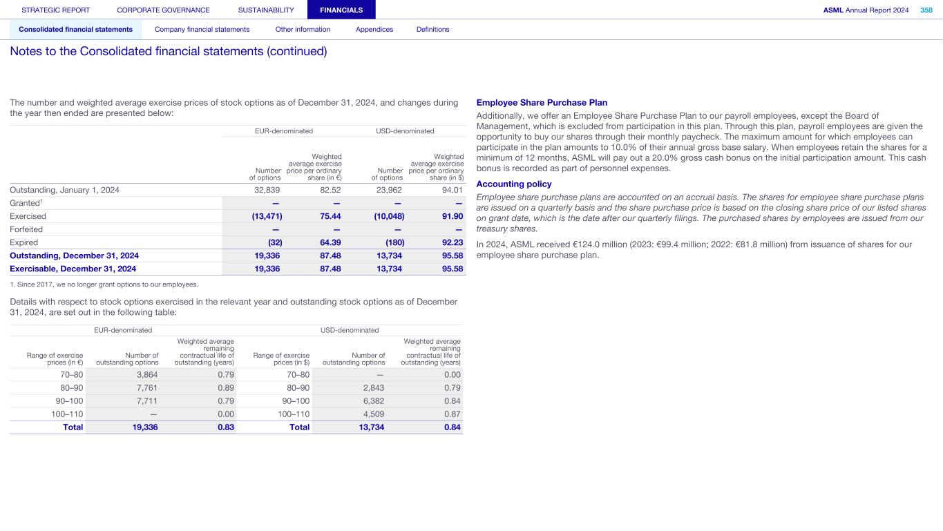 截至2024年12月31日的股票期权数量和加权平均行权价,以及该日终了年度的变动情况列示如下:欧元计价的美元计价的期权数量每股普通股加权平均行权价(欧元)未行使的期权数量每股普通股加权平均行权价(美元)2024年1月1日32,83982.5223,96294.01授予1 ————已行使(13,471)75.44(10,048)91.90没收————已到期(32)64.39(180)92.23未行使,2024年12月31日19,33687.48 13,73495.58可行使,2024年12月31日19,33687.48 13,73495.58 1。自2017年起,我们不再向员工授予期权。有关于有关年度行使的股票期权及截至2024年12月31日尚未行使的股票期权的详情,如下表所示:以欧元计价的美元计价的行权价格区间(欧元)未行使期权数量加权平均未行使剩余合同期限(年)行权价格区间(美元)未行使期权数量加权平均未行使剩余合同期限(年)70 – 803,8640.79 70 – 80 — 0.0080 – 907,76 10.89 80 – 902,8430.7990 – 1007,7110.7990 – 1006,3820.84 100 – 110 — 0.00 100 – 1104,5090.87总计19,3360.83总计13,7340.84员工购股计划此外,我们向我们的发薪员工提供员工购股计划,但董事会除外,它被排除在参与这项计划之外。通过这个计划,发工资的员工有机会通过他们的月薪购买我们的股票。雇员可参加该计划的最高金额为其年基本工资毛额的10.0%。当员工保留股份至少12个月时,ASML将支付初始参与金额20.0%的总现金红利。这笔现金奖金作为人员开支的一部分入账。会计政策员工股份购买计划按权责发生制核算。员工股份购买计划的股份按季度发行,股份购买价格基于我们上市股票在授予日的收盘价,即我们季度申报后的日期。职工购买的股票是从我们的库存股中发行的。2024年,ASML从发行股票中获得了1.24亿欧元(2023年:9940万欧元;2022年:8180万欧元),用于我们的员工股份购买计划。战略报告公司治理可持续发展金融公司ASML年度报告2024358合并财务报表公司财务报表其他信息附录定义合并财务报表附注(续)