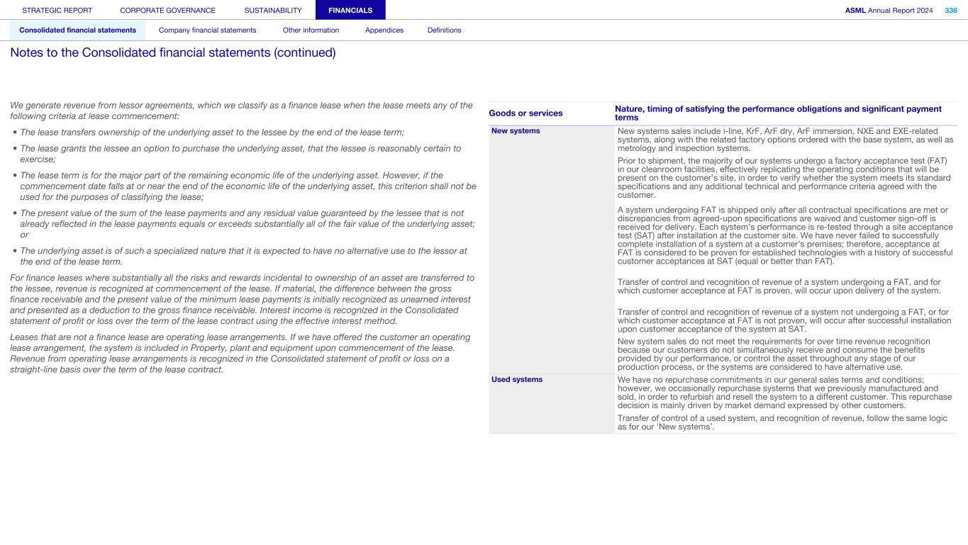 我们从出租人协议中产生收入,当租赁在租赁开始时满足以下任何一项标准时,我们将其归类为融资租赁:•租赁在租赁期结束时将标的资产的所有权转让给承租人;•租赁授予承租人购买标的资产的选择权,承租人合理确定会行使该选择权;•租赁期为标的资产剩余经济年限的主要部分。但是,如果起始日落在标的资产经济年限结束时或临近结束时,这一标准不得用于对租赁进行分类;•租赁付款额与承租人担保的尚未反映在租赁付款额中的任何剩余价值之和的现值等于或几乎超过标的资产公允价值的全部;或•标的资产具有如此专门化的性质,预计在租赁期结束时对出租人没有替代用途。对于将资产所有权附带的几乎所有风险和报酬转移给承租人的融资租赁,在租赁开始时确认收入。如果重大,应收融资毛额与最低租赁付款额现值之间的差额初步确认为未实现利息,并在应收融资毛额中列报为扣除项。利息收入在租赁合同期限内采用实际利率法在综合损益表中确认。非融资租赁的租赁为经营租赁安排。如果我们已向客户提供经营租赁安排,则该系统在租赁开始时包含在物业、厂房和设备中。经营租赁安排的收入在租赁合同期限内按直线法在综合损益表中确认。新系统新系统销售包括i-line、KrF、ArF Dry、ArF浸没式、NXE和EXE相关系统,以及与基地系统一起订购的相关工厂选项,以及计量和检测系统。在发货前,我们的大多数系统在我们的洁净室设施中进行工厂验收测试(FAT),有效地复制将出现在客户现场的操作条件,以验证系统是否符合其标准规格以及与客户商定的任何附加技术和性能标准。进行FAT的系统只有在满足所有合同规格或放弃与商定规格的差异并收到客户签字交付后才能发货。每个系统的性能在客户现场安装后通过现场验收测试(SAT)进行重新测试。我们从来没有失败过在客户的场所成功完成系统的安装;因此,FAT的接受度被认为是证明了具有SAT成功客户接受度历史的既定技术(与FAT相同或更好)。发生FAT的系统的控制权转移和收入确认,且客户在FAT的接受度得到证明,将在系统交付时发生。未进行FAT的系统的控制权转移和收入确认,或客户在FAT的接受度未得到证明,将在客户在SAT接受系统后成功安装后发生。新系统销售不符合超时收入确认的要求,因为我们的客户没有同时接受和消耗我们的业绩提供的利益,或在我们生产过程的任何阶段控制资产,或系统被认为具有替代用途。二手系统我们的一般销售条款和条件中没有回购承诺;但是,我们偶尔会回购我们以前制造和销售的系统,以便翻新并将系统转售给不同的客户。这一回购决定主要是由其他客户表达的市场需求推动的。转让一个使用过的系统的控制权,并确认收入,遵循与我们的‘新系统’相同的逻辑。商品或服务的性质、履行履约义务的时间安排和重大付款条件战略报告公司治理可持续发展财务ASML年度报告2024336合并财务报表公司财务报表其他信息附录定义合并财务报表附注(续)