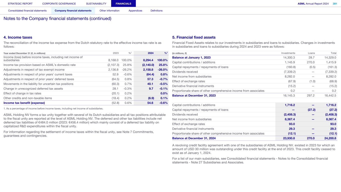 4.所得税荷兰法定税率的所得税费用与实际所得税率的对账如下:截至12月31日止年度(欧元,单位:百万)2023% 12024% 1所得税前收入(亏损),含子公司净收益8,168.0 100.0% 8,294.4 100.0%所得税按ASML国内税率计提(2,107.3)25.8%(2,140.0)25.8%免税收入调整2,136.8-26.2 % 2,158.8-26.0 %以前年度当期税项调整52.9-0.6 %(64.4)0.8%以前年度递延税项调整(64.5)0.8% 57.3-0.7 %不确定税务状况负债变动(60.3)0.7% 40.1-0.5 %未确认递延所得税资产变动28.1-0.3 % 9.7-0.1 %税率变动影响(20.1)0.2% 0.0%其他抵免和非应税项目(18.4)0.2%(6.9)0.1%所得税优惠(费用)(52.8)0.6% 54.6-0.6 % 1。占所得税前收入的百分比,包括子公司的净收益。阿斯麦 NV与其几家荷兰子公司形成税务统一,所有归属于财政统一的税务情况均在阿斯麦 NV层面报告。递延和其他税项负债包括4.84亿欧元的递延税项负债净额(2023年:4.564亿欧元),主要包括财政统一范围内资本化研发支出的递延税项负债。有关财政统一范围内所得税清算的信息,见附注7 ——承诺、保证和或有事项。5.金融固定资产金融固定资产是指我们对子公司的投资和对子公司的贷款。2024和2023年对子公司投资和对子公司贷款变动情况如下:(百万,欧元)投资贷款2023年1月1日总余额14,300.328.7 14,329.0出资/增加1,145.92 70.01,415.9偿还资本/偿还贷款(160.8)(0.5)(161.3)收到的股利(7,339.2)—(7,339.2)子公司净收益8,28 2.0 — 8,28 2.0汇率影响(67.9)(1.0)(68.9)衍生金融工具(15.2)—(15.2)按比例应占联营公司其他综合收益0.2 — 0.2 12月31日余额,202316,145.32 97.216,442.5出资/增加1,716.2 — 1,716.2偿还资本/偿还贷款—(27.2)(27.2)收到的股息(2,408.3)—(2,408.3)子公司净收入8,367.4 — 8,367.4汇率影响93.09 3.0衍生金融工具29.3 —按比例应占联营公司其他综合收益(12.1)—(12.1)2024年12月31日余额23,930.82 70.024,200.8与阿斯麦 NV.的其中一家子公司的循环信贷融资协议于2023年存在,截至2023年底该信贷融资项下未偿还金额为3,000万美元。截至2024年1月1日,这一信贷安排已不复存在。有关我们主要子公司的名单,请参阅合并财务报表-合并财务报表附注-附注27子公司和联营公司。战略报告公司治理可持续发展金融公司ASML年度报告2024391合并财务报表公司财务报表其他信息附录定义公司财务报表附注(续)