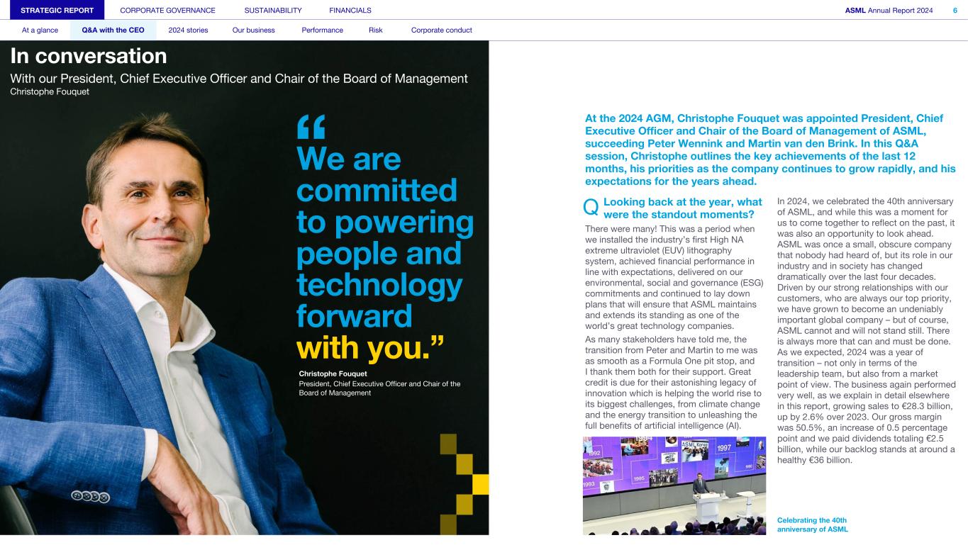 我们致力于与您一起推动人类和技术向前发展。”Christophe Fouquet总裁、首席执行官兼管理委员会主席战略报告公司治理可持续性财务2024年度报告6与首席执行官问答一览2024年的故事我们的业务绩效风险公司行为在2024年年度股东大会上与我们的总裁、首席执行官兼管理委员会主席Christophe Fouquet交谈时,任命Christophe Fouquet为ASML总裁、首席执行官兼管理委员会主席,接替Peter Wennink和Martin van den Brink。在这个问答环节中,克里斯托夫概述了过去12个月的主要成就,随着公司继续快速增长,他的优先事项,以及他对未来几年的期望。Q回顾这一年,有哪些出彩的时刻?2024年,我们庆祝了ASML成立40周年,而这既是我们走到一起反思过去的时刻,也是一次向前看的机会。ASML曾经是一家没人听说过的默默无闻的小公司,但在过去的四十年里,它在我们行业和社会中的角色发生了巨大的变化。在我们与客户的牢固关系的推动下——客户始终是我们的首要任务——我们已经成长为一家无可否认的重要的全球性公司——但当然,ASML不能也不会停滞不前。总有更多的事情可以做,也必须做。正如我们所预料的那样,2024年是过渡的一年——不仅是在领导团队方面,从市场的角度来看也是如此。该业务再次表现出色,正如我们在本报告其他部分详细解释的那样,销售额增长至283亿欧元,比2023年增长2.6%。我们的毛利率为50.5%,增加了0.5个百分点,我们支付了总计25亿欧元的股息,而我们的积压订单约为360亿欧元。有很多!在这段时间里,我们安装了业界首个高NA极紫外(EUV)光刻系统,实现了符合预期的财务业绩,兑现了我们的环境、社会和治理(ESG)承诺,并继续制定计划,以确保ASML保持并扩大其作为世界伟大技术公司之一的地位。正如许多利益相关者告诉我的那样,从彼得和马丁到我的过渡就像一级方程式进站一样顺利,我感谢他们俩的支持。他们令人惊讶的创新遗产值得称赞,这些创新正在帮助世界迎接最大的挑战,从气候变化和能源转型到释放人工智能(AI)的全部好处。庆祝ASML成立40周年