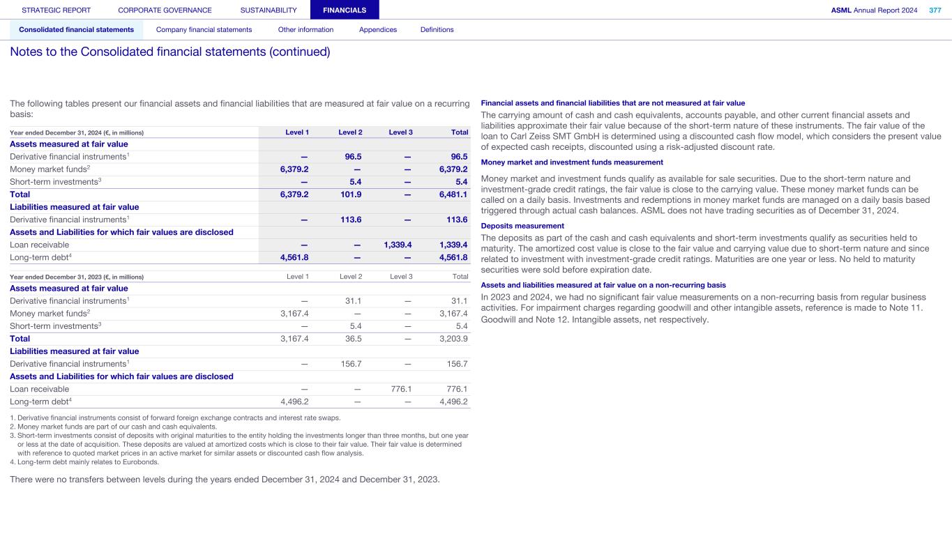 下表列示了我们以经常性基础以公允价值计量的金融资产和金融负债:截至2024年12月31日止年度(欧元,百万元)第1级第2级第3级以公允价值计量的衍生金融工具资产总额1 — 96.5 — 96.5货币市场基金26,379.2 —— 6,379.2短期投资3 — 5.4 — 5.4合计6,379.2 101.9 — 6,481.1以公允价值计量的衍生金融工具负债1 — 113.6 — 113.6披露公允价值的资产和负债应收贷款—— 1,339.41,339.4长期债务4,56 1.8 —— 4,56 1.8截至2023年12月31日止年度(欧元,百万元)第1级第2级第3级以公允价值计量的资产总额衍生金融工具1 — 31.1 — 31.1货币市场基金23,167.4 —— 3,167.4短期投资3 — 5.4 — 5.4合计3,167.4 36.5 — 3,203.9以公允价值计量的负债衍生金融工具1 — 156.7 — 156.7披露公允价值的资产和负债应收贷款—— 776.17 76.1长期债务4,496.2 —— 4,496.21。衍生金融工具由远期外汇合约和利率互换构成。2.货币市场基金是我们现金和现金等价物的一部分。3.短期投资包括原始到期日存放于持有投资的实体超过三个月,但在取得之日为一年或一年以下的存款。这些存款按接近其公允价值的摊余成本估值。其公允价值参照同类资产活跃市场中的市场报价或现金流折现分析确定。4.长期债务主要涉及欧洲债券。截至2024年12月31日和2023年12月31日止年度,没有级别之间的转移。不以公允价值计量的金融资产和金融负债现金及现金等价物、应付账款、其他流动金融资产和负债的账面价值与其公允价值相近,因为这些工具具有短期性。向Carl Zeiss SMT GmbH贷款的公允价值是使用贴现现金流模型确定的,该模型考虑了预期现金收入的现值,使用风险调整贴现率进行贴现。货币市场和投资基金计量货币市场和投资基金符合可供出售证券的条件。由于短期性质和投资级信用评级,公允价值接近账面价值。这些货币市场基金可按日调用。货币市场基金的投资和赎回按日管理,以通过实际现金余额触发为基础。截至2024年12月31日,ASML没有交易证券。存款计量作为现金及现金等价物和短期投资一部分的存款符合持有至到期证券的条件。摊余成本价值接近公允价值和账面价值,这是由于短期性质,因为与投资级信用评级的投资有关。期限为一年或更短。到期前未卖出持有至到期证券。以非经常性基础以公允价值计量的资产和负债在2023和2024年,我们没有从经常性经营活动中以非经常性基础进行重大公允价值计量。关于商誉和其他无形资产的减值费用,请参见附注11。商誉及附注12。分别为无形资产,净值。战略报告公司治理可持续发展财务ASML年度报告2024377合并财务报表公司财务报表其他信息附录定义合并财务报表附注(续)