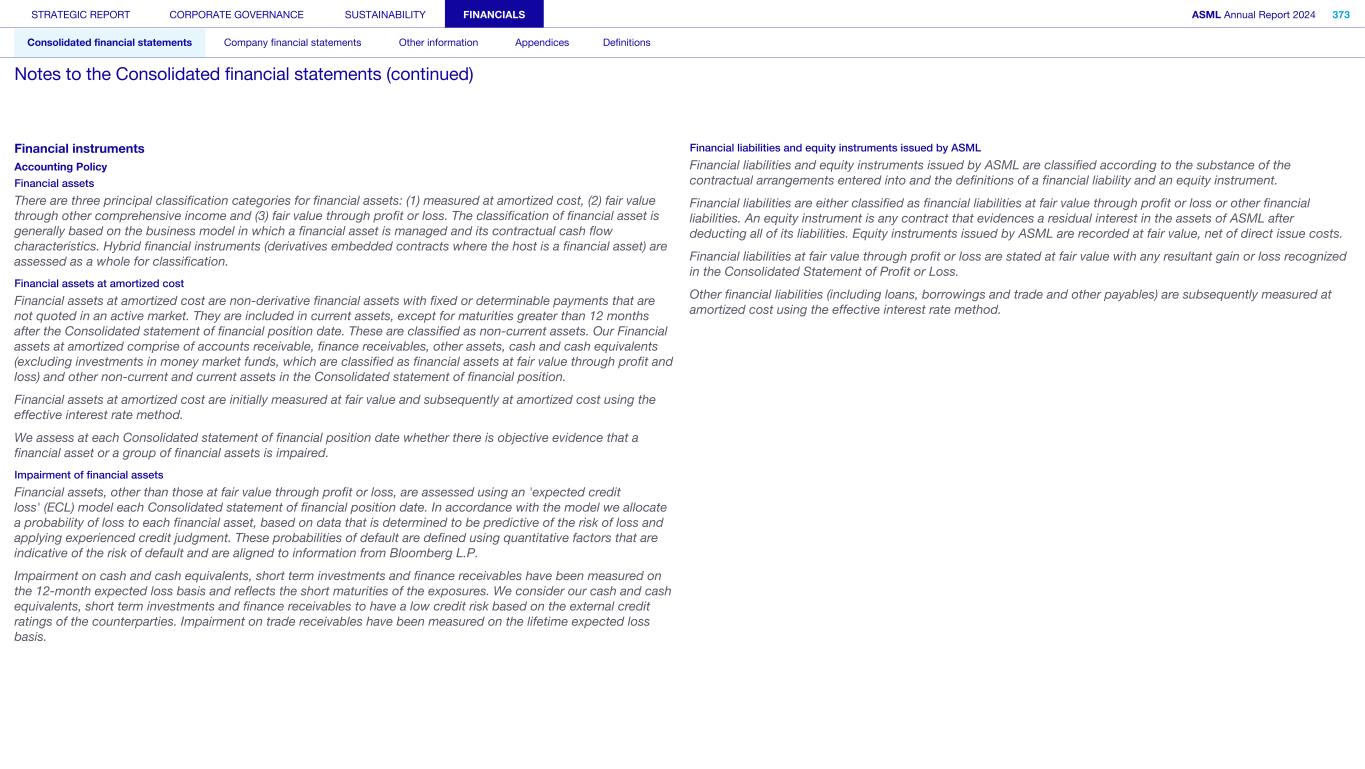 金融工具会计政策金融资产金融资产有三个主要分类类别:(1)以摊余成本计量,(2)通过其他综合收益的公允价值和(3)通过损益的公允价值。金融资产的分类一般是根据一项金融资产所管理的业务模式及其合同现金流量特征进行分类。混合型金融工具(主体为金融资产的衍生工具嵌入合约)整体评估分类。以摊余成本计量的金融资产以摊余成本计量的金融资产是指在活跃市场中没有报价、回款固定或可确定的非衍生金融资产。它们计入流动资产,但合并财务状况表日后超过12个月的到期日除外。这些被归类为非流动资产。我们的已摊销金融资产包括应收账款、应收融资款、其他资产、现金及现金等价物(不包括货币市场基金投资,其分类为按公平值计入损益的金融资产)以及综合财务状况表中的其他非流动及流动资产。以摊余成本计量的金融资产采用公允价值进行初始计量,随后采用实际利率法以摊余成本进行后续计量。我们在每个合并财务状况表日评估是否有客观证据表明某一金融资产或一组金融资产发生了减值。金融资产减值除以公允价值计入损益的金融资产外,每个综合财务状况表日均使用‘预期信用损失’(ECL)模型进行评估。我们按照模型为每一种金融资产分配一个损失概率,基于被确定为可预测损失风险的数据并应用有经验的信用判断。这些违约概率是使用指示违约风险的数量因子定义的,并与Bloomberg L.P.的信息保持一致。现金和现金等价物、短期投资和应收融资的减值已按12个月预期损失基础计量,并反映了风险敞口的短期期限。根据交易对手的外部信用评级,我们认为我们的现金及现金等价物、短期投资和应收融资款的信用风险较低。贸易应收款项减值已按存续期预期亏损基准计量。ASML发行的金融负债和权益工具由ASML发行的金融负债和权益工具,按照订立的合同安排的实质内容以及金融负债和权益工具的定义进行分类。金融负债或分类为以公允价值计量且其变动计入损益的金融负债或其他金融负债。权益工具是任何一份合同,证明在ASML资产中扣除其全部负债后的剩余权益。ASML发行的权益工具以公允价值(扣除直接发行成本)入账。以公允价值计量且其变动计入损益的金融负债按公允价值列报,由此产生的任何损益均在综合损益表中确认。其他金融负债(包括贷款、借款和贸易及其他应付款项)采用实际利率法按摊余成本进行后续计量。战略报告公司治理可持续发展财务ASML年度报告2024373合并财务报表公司财务报表其他信息附录定义合并财务报表附注(续)