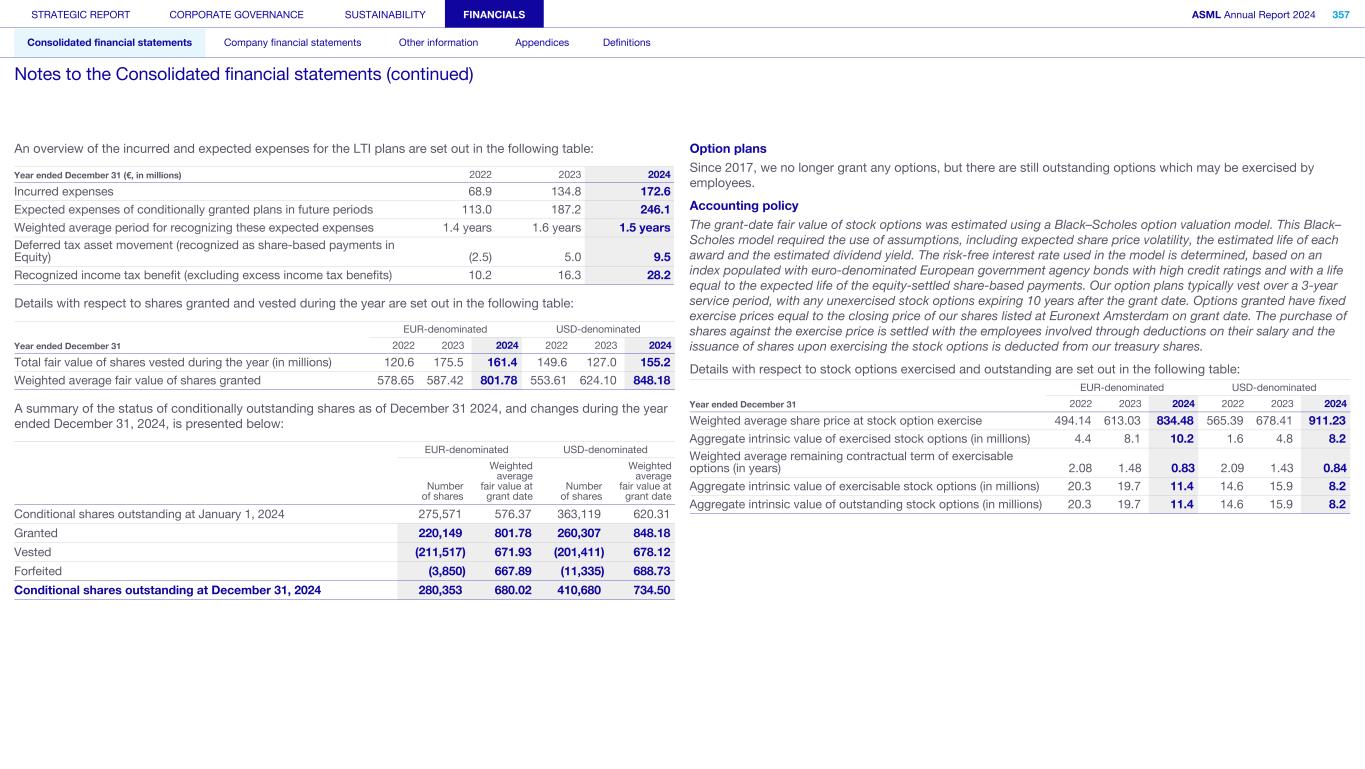 下表列出了LTI计划的已发生和预期费用概览:截至12月31日止年度(欧元,百万)202220232024已发生费用68.91 34.817 2.6未来期间有条件授予计划的预期费用113.01 87.2246.1确认这些预期费用的加权平均期间1.4年1.6年1.5年递延所得税资产变动(在权益中确认为以股份为基础的支付)(2.5)5.09.5确认的所得税优惠(不包括超额所得税优惠)10.2 16.328.2有关授予股份的详情年内归属及年内归属公允价值合计(百万)120.61 75.5161.41 49.6 127.01 55.2已授予股份的加权平均公允价值578.65587.42801.78553.61624.10848.18截至12月31日的欧元计价美元计价年度202220232024202220232024截至2024年12月31日的有条件流通股状况及截至2024年12月31日止年度的变动情况汇总如下:没收(3,850)667.89(11,335)688.73截至12月31日已发行在外的有条件股份,2024280,353680.02 410,680734.50欧元计价的美元计价的股份数量授予日的加权平均公允价值股份数量授予日的加权平均公允价值2024年1月1日已发行在外的有条件股份275,571576.37363,119620.31授予220,149801.78 260,307848.18既得(211,517)671.93(201,411)678.12期权计划自2017年起,我们不再授予任何期权,但仍有未行使的期权可能由员工行使。会计政策股票期权的授予日公允价值采用Black – Scholes期权估值模型进行估计。这个Black – Scholes模型需要使用假设,包括预期股价波动、每个奖励的估计寿命和估计的股息收益率。模型中使用的无风险利率是根据一个指数确定的,该指数填充了以欧元计价、信用评级较高、寿命与以权益结算的股份支付的预期寿命相等的欧洲政府机构债券。我们的期权计划通常在3年服务期内归属,任何未行使的股票期权将在授予日期后10年到期。授予的期权的固定行权价格等于我们在授予日在阿姆斯特丹泛欧交易所上市的股票的收盘价。对行权价买入股票,通过扣减员工工资和股票期权行权时发行股票,从我们的库存股中扣除,与所涉员工进行结算。有关已行使股票期权的详情及未行使情况如下表所示:欧元计价美元计价截至2022年12月31日止年度2022202320242022202320232024股票期权行权加权平均股价494.14613.03 834.48 565.39678.4 1911.23已行使股票期权总内在价值(百万)4.48.1 10.2 1.6 4.88.2可行使期权加权平均剩余合同期限(年)2.08 1.48 0.83 2.09 1.43 0.84可行使股票期权总内在价值(百万)20.3 19.71 1.41 4.6 15.98.2已行使股票期权总内在价值(百万)20.3 19.71 1.41 4.6 15.98.2战略报告公司治理可持续发展金融公司ASML年度报告2024357合并财务报表公司财务报表其他信息附录定义合并财务报表附注(续)