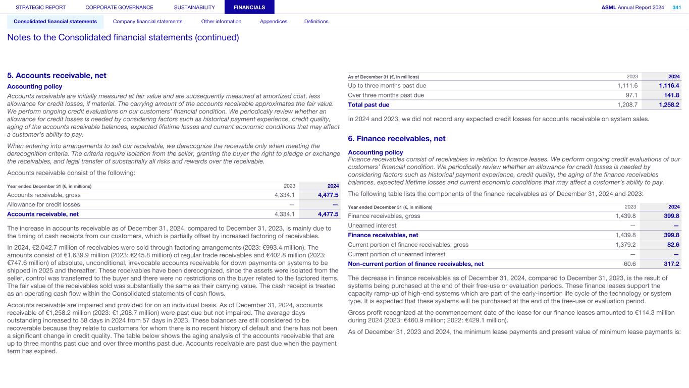 5.应收账款、净额会计政策应收账款初始按公允价值计量,后续按摊余成本减信用损失准备(如重大)计量。应收账款的账面金额与公允价值相近。我们对客户的财务状况进行持续的信用评估。我们通过考虑可能影响客户支付能力的历史付款经验、信用质量、应收账款余额的账龄、预期存续期损失和当前经济状况等因素,定期审查是否需要为信用损失计提准备金。在订立出售我们的应收款项的安排时,我们仅在满足终止确认标准时终止确认应收款项。标准要求与卖方隔离,授予买方应收款质押或交换的权利,并合法转移对应收款几乎所有的风险和报酬。应收账款包括:截至12月31日止年度(欧元,百万)20232024年应收账款,毛额4,334.14,477.5信用损失备抵——应收账款,净额4,334.14,477.5截至2024年12月31日的应收账款与2023年12月31日相比增加,主要是由于我们的客户收到现金的时间安排,这部分被应收账款保理增加所抵消。2024年,通过保理安排出售了20.427亿欧元的应收账款(2023年:9.934亿欧元)。这些金额包括16.399亿欧元(2023年:2.458亿欧元)的常规贸易应收款和4.028亿欧元(2023年:7.476亿欧元)的绝对、无条件、不可撤销的应收账款,用于支付将于2025年及之后发货的系统的首付款。这些应收款已被终止确认,因为资产与卖方隔离,控制权转移给买方,买方没有与保理项目相关的限制。出售的应收款项的公允价值与其账面价值基本相同。现金收入在合并现金流量表中作为经营现金流量处理。应收账款进行减值,并按个别情况计提拨备。截至2024年12月31日,应收账款12.582亿欧元(2023年:12.087亿欧元)已逾期但未减值。未偿还的平均天数从2023年的57天增加到2024年的58天。这些余额仍被认为是可以收回的,因为它们与近期没有违约历史且信用质量没有重大变化的客户有关。下表为逾期最多三个月、逾期超过三个月的应收账款账龄分析。应收账款在付款期限届满时已逾期。截至12月31日(欧元,百万)20232024年截至逾期三个月1,111.61,116.4逾期三个月97.11 41.8逾期总额1,208.71,258.2在2024年和2023年,我们没有记录系统销售应收账款的任何预期信用损失。6.应收融资款项净额会计政策应收融资款项包括与融资租赁有关的应收款项。我们对客户的财务状况进行持续的信用评估。我们通过考虑历史支付经验、信用质量、应收融资款余额的账龄、预期存续期损失和可能影响客户支付能力的当前经济状况等因素,定期审查是否需要计提信用损失准备金。下表列出截至2024年12月31日和2023年12月31日应收融资款的构成部分:截至12月31日止年度(欧元,单位:百万)20232024年应收融资款,毛额1,439.8 399.8未实现利息——应收融资款,净额1,439.8 399.8应收融资款流动部分,毛额1,379.28 2.6未实现利息流动部分——应收融资款非流动部分,净额60.63 17.2与2023年12月31日相比,截至2024年12月31日应收融资款的减少是由于系统在其免费使用或评估期结束时购买的结果。这些融资租赁支持高端系统的产能爬坡,这些系统属于技术或系统类型的早期插入生命周期的一部分。预计这些系统将在免费使用或评估期结束时购买。2024年期间,我们的融资租赁在租赁开始日确认的毛利润为1.143亿欧元(2023年:4.609亿欧元;2022年:4.291亿欧元)。截至2023年12月31日和2024年12月31日,最低租赁付款额和最低租赁付款额的现值为:战略报告公司治理可持续金融ASML年度报告2024341合并财务报表公司财务报表其他信息附录定义合并财务报表附注(续)