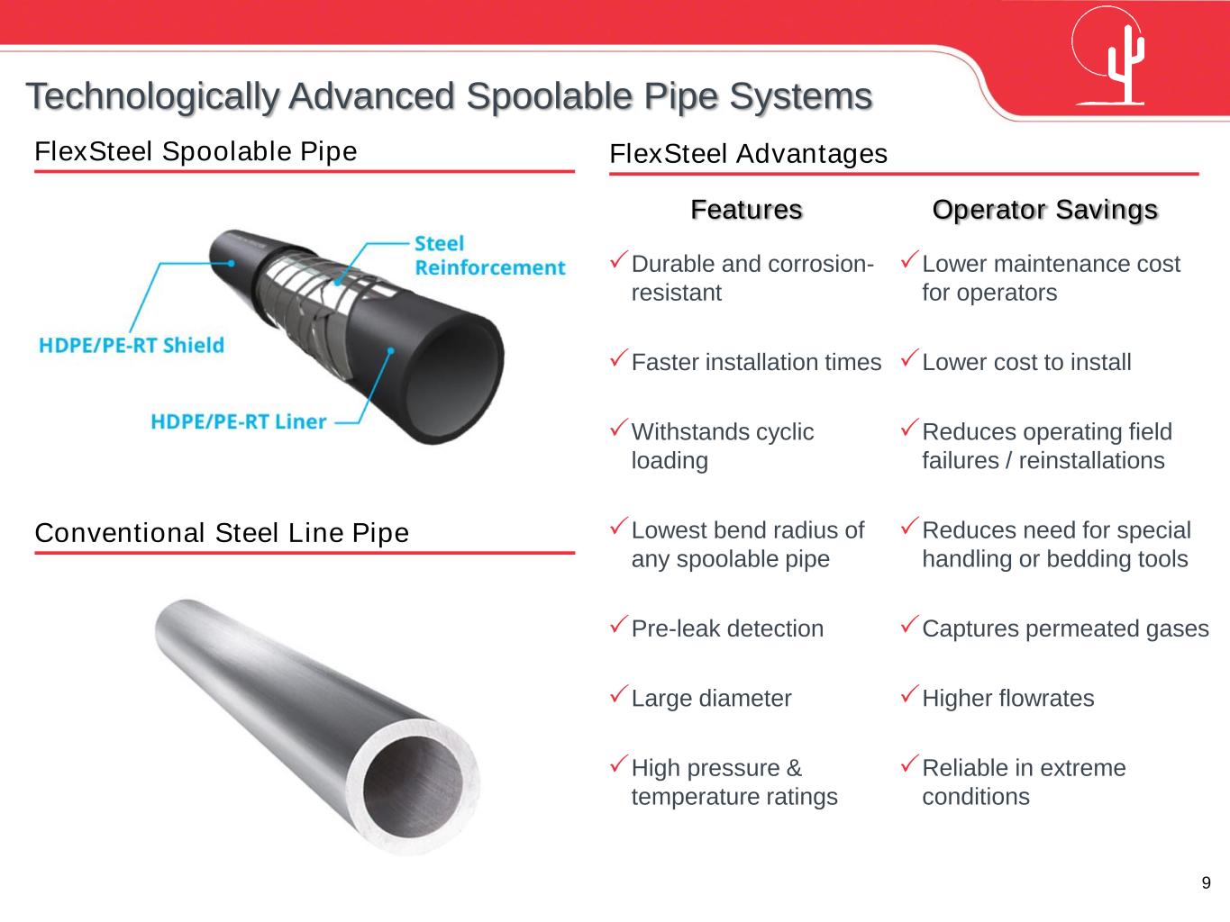 9种技术先进的可假脱管系统降低操作员的维护成本更低的安装成本减少了操作现场故障/重新安装减少了对特殊处理或垫料工具捕获渗透气体的需求更高的流量在极端条件下可靠耐用和耐腐蚀更快的安装时间可承受循环加载任何可假脱管的最低弯曲半径预泄漏检测大直径高压和温度等级特点操作员节省常规钢管线管FlexSteel可假脱管FlexSteel优点