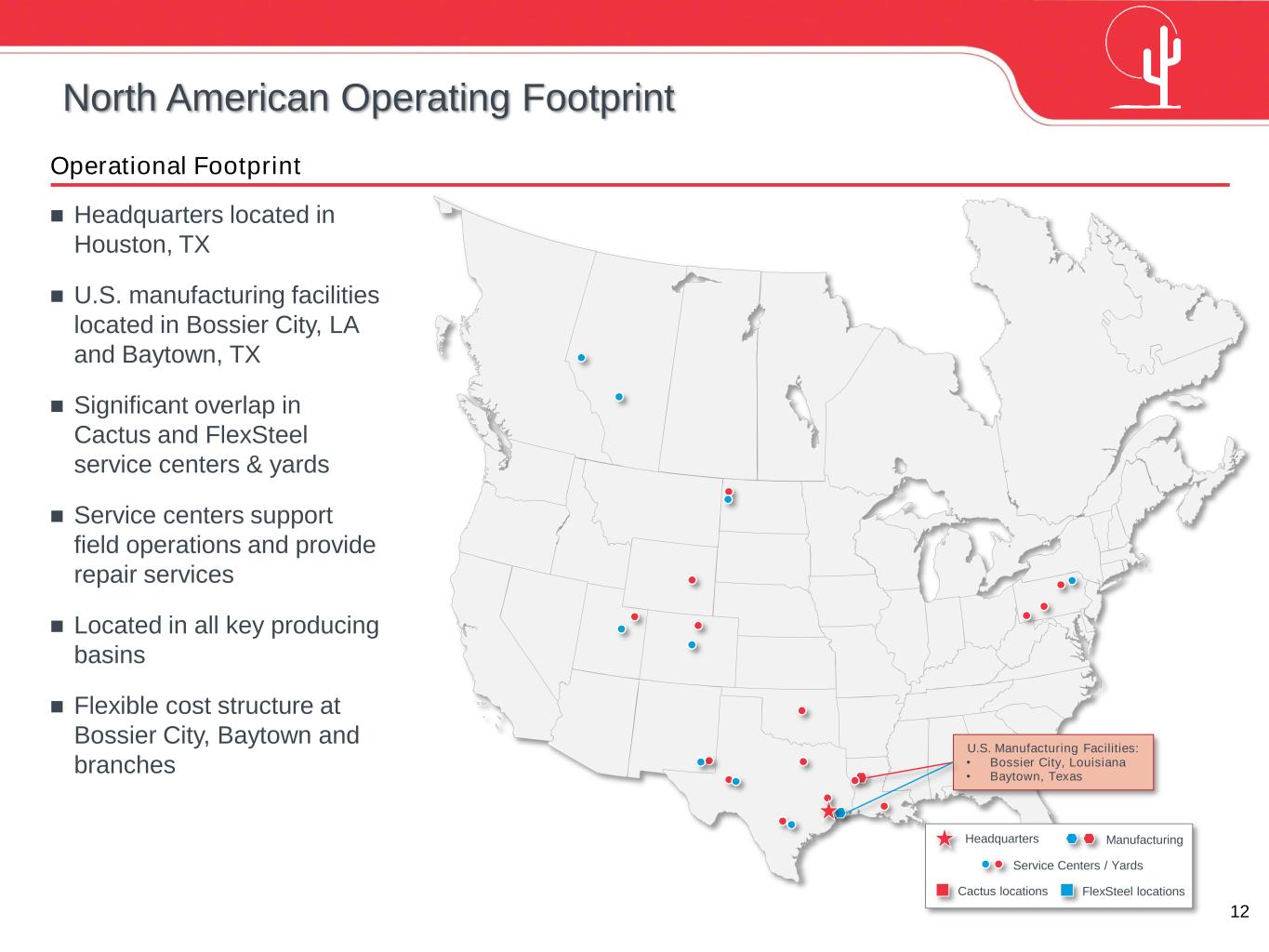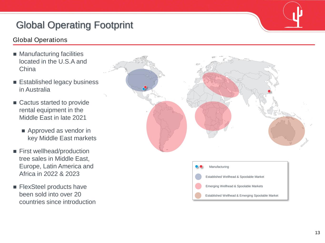 12◼总部位于德克萨斯州休斯顿◼位于洛杉矶Bossier市和德克萨斯州Baytown的美国制造工厂◼Cactus和FlexSteel服务中心&堆场的重大重叠◼服务中心支持外地行动并提供维修服务◼位于所有重点生产盆地◼Bossier City、Baytown和分支机构的灵活成本结构运营足迹北美运营足迹美国制造设施:•路易斯安那州Bossier City •德克萨斯州Baytown总部制造服务中心/庭院仙人掌地点FlexSteel地点