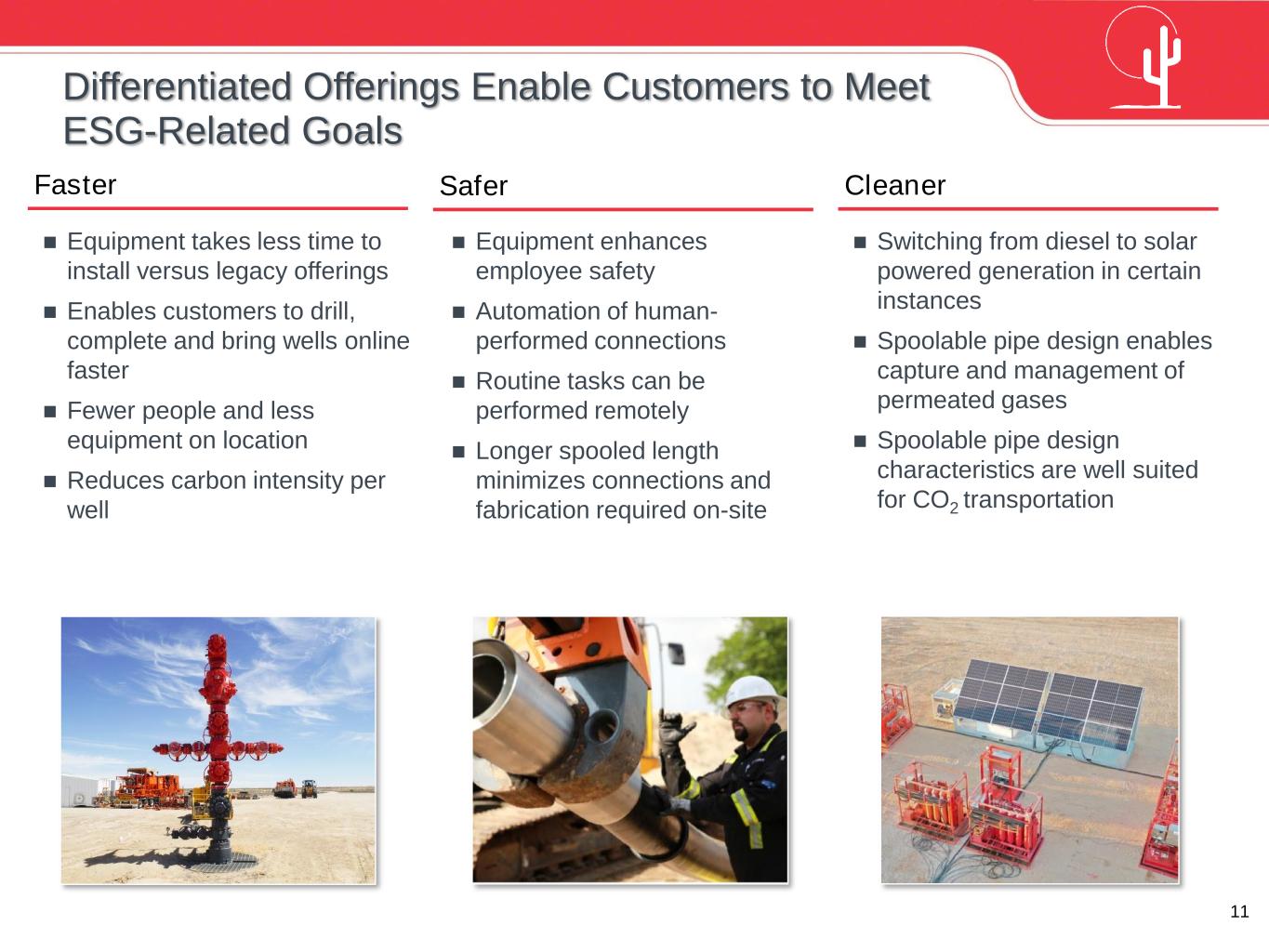 11种差异化产品使客户能够实现ESG相关目标◼与传统产品相比,设备安装所需时间更少◼使客户能够钻孔,完成并使油井更快上线◼现场人员少设备少◼降低每口井的碳强度◼设备提升员工安全◼人为连接的自动化◼常规任务可以远程执行◼更长的盘绕长度可最大限度地减少现场所需的连接和制造◼在某些情况下从柴油转向太阳能发电◼可假脱管设计可实现渗透气体的捕获和管理◼可缠绕管道设计特性非常适合CO2运输更快更安全更清洁