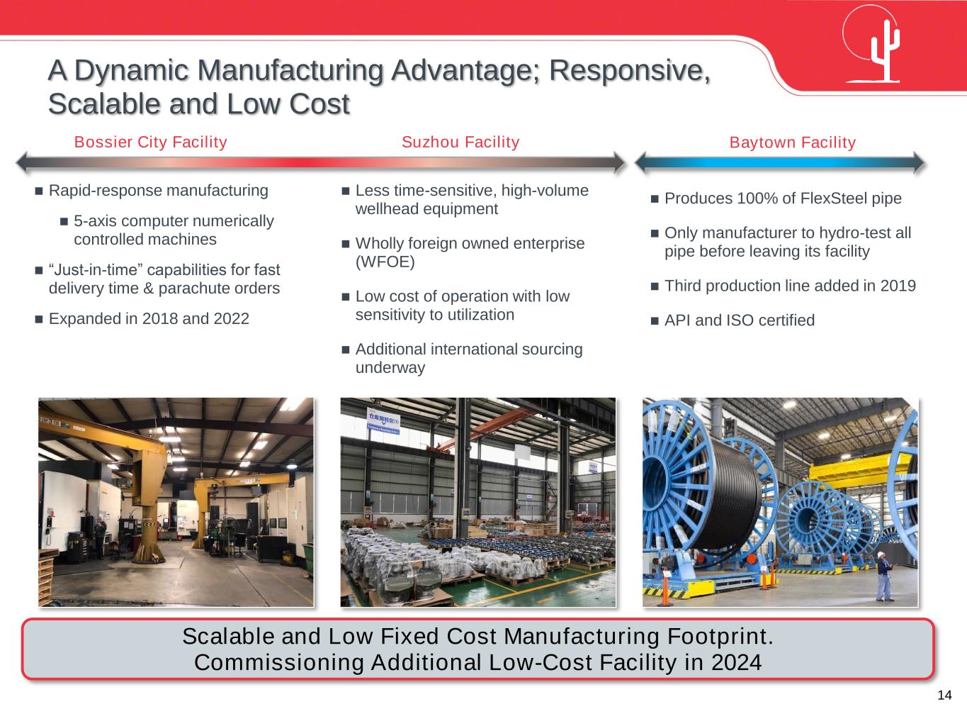 13全球业务◼位于美国和中国的制造设施◼在澳大利亚建立传统业务◼Cactus于2021年末开始在中东提供租赁设备◼被批准为中东关键市场的供应商◼2022 & 2023年中东、欧洲、拉丁美洲和非洲地区首次井口/生产树销售◼FlexSteel产品自引入以来已销往20多个国家全球运营足迹建立井口&可缠绕市场新兴井口&可缠绕市场制造建立井口&新兴可缠绕市场
