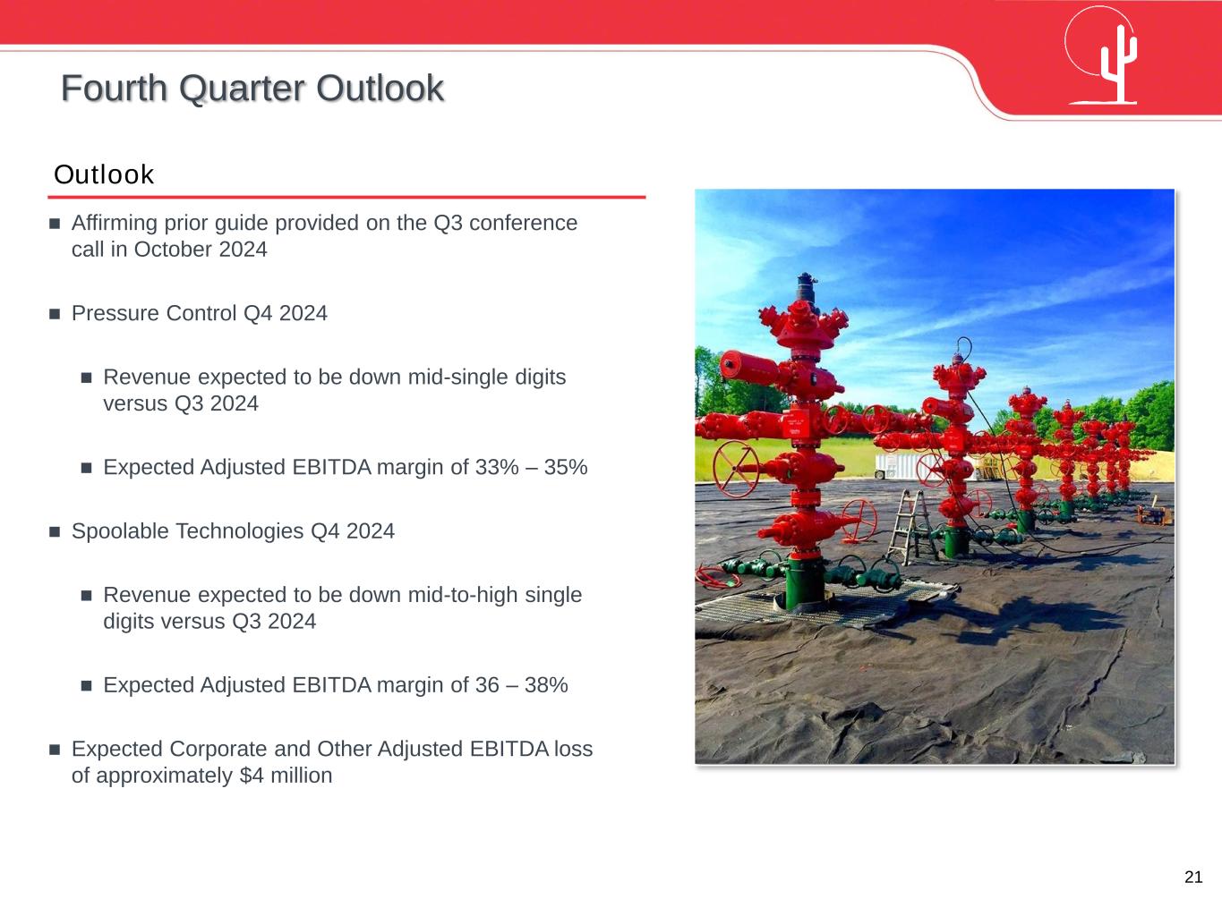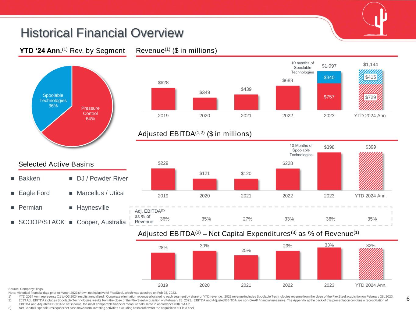 628% 30% 25% 29% 33% 32% 20192020202120222023年初至今2024安。36% 35% 27% 33% 36% 35% $ 757 $ 729 $ 340 $ 415 $ 628 $ 349 $ 439 $ 688 $ 1,097 $ 1,14420192020202120222023 YTD 2024 Ann。收入(1)(百万美元)历史财务概览来源:公司文件。注:2023年3月之前的历史财务数据显示不包括2023年2月28日收购的FlexSteel。1)YTD 2024 Ann.represents Q1 to Q3 2024 results annualized。按年初至今收入份额分配给各细分市场的企业淘汰收入。2023年的收入包括Spoolable Technologies在2023年2月28日完成对FlexSteel收购后的收入。2)2023 Adj. EBITDA包括Spoolable Technologies自2023年2月28日FlexSteel收购完成后的业绩。EBITDA和调整后EBITDA是非公认会计准则财务指标。本演示文稿后面的附录包含EBITDA和调整后EBITDA与净收入的对账,这是根据GAAP计算的最具可比性的财务指标。3)净资本支出等于投资活动产生的现金流量净额,不包括收购FlexSteel的现金流出。调整后EBITDA(2)–净资本支出(3)占收入的百分比(1)33.4%利润率37.1%利润率调整后EBITDA(1,2)(百万美元)调整后EBITDA(2)占收入的百分比$ 229 $ 121 $ 120 $ 228 $ 398 $ 399 20192020202120222023 YTD 2024 Ann。压力控制64% Spoolable Technologies 36% YTD'24 Ann.(1)Rev. by segment◼巴肯◼伊格尔·福特◼二叠纪◼SCOOP/STACK选定活动盆地◼DJ/Powder River◼马塞勒斯/尤蒂卡◼海恩斯维尔◼澳大利亚库珀10个月的可欺骗技术10个月的可欺骗技术
