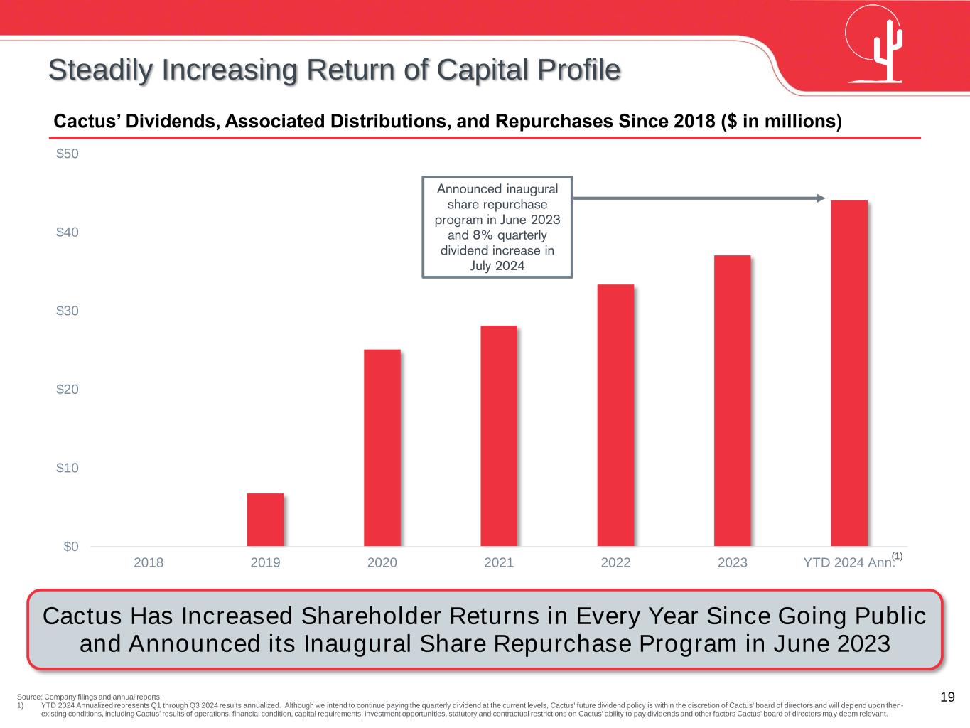 19 $ 0 $ 10 $ 20 $ 30 $ 40 $ 50201820192020202120222023 YTD 2024 Ann。Cactus自2018年以来的股息、关联分配和回购(百万美元)来源:公司文件和年度报告。1)2024年年初至今年化代表2024年第一季度至第三季度业绩年化。虽然我们打算继续按目前水平支付季度股息,但Cactus未来的股息政策由Cactus董事会酌情决定,并将取决于当时的现有条件,包括Cactus的经营业绩、财务状况、资本要求、投资机会、对Cactus支付股息能力的法定和合同限制以及Cactus董事会可能认为相关的其他因素。仙人掌自上市以来每年的股东回报都在增加,并于2023年6月宣布首次股份回购计划稳步增加资本状况回报(1)于2023年6月宣布首次股份回购计划,并于2024年7月宣布季度股息增加8%