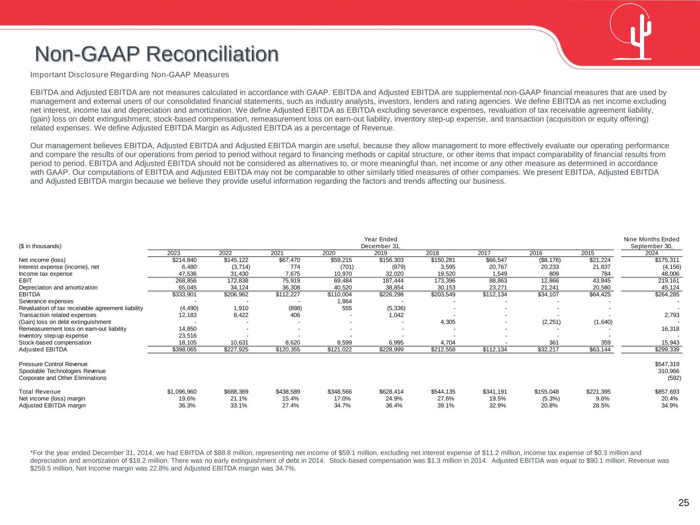25年度截至9个月(单位:千美元)2023年12月31日、9月30日202220212020201920182017201620152024净收入(亏损)214,840美元145,122美元67,470美元59,215美元156,303美元150,281美元66,547美元(8,176美元)21,224美元175,311美元利息支出(收入),净额6,480(3,714)774(701)(879)3,59520,76720,23321,837(4,156)所得税费用47,53631,4307,67510,97032,0 2019,5151,54980978448,0 06息税前利润268,856172,83875,91969,484187,444173,39688,86312,86643,845219,161折旧和摊销65,04534,12436,30840,52038,85430,15323,27121,24120,58045,124 EBITDA $ 333,901 $ 206,962 $ 112,227 $ 110,004 $ 226,298 $ 203,549 $ 112,134 $ 34,107 $ 64,425 $ 264,285遣散费---1,864------重估应收税款协议负债(4,490)1,910(898)555(5,336)-----交易相关费用12,1838,422406-1,042-----2,793(收益)债务清偿损失----4,305-(2,251)(1,640)-盈利负债重新计量损失14,850--------股票薪酬18,10510,6318,6208,5996,9954,704-36135915,943调整后EBITDA $ 398,065 $ 227,925 $ 120,355 $ 121,022 $ 228,999 $ 212,558 $ 112,134 $ 32,217 $ 63,144 $ 299,339压力控制收入$ 547,319 Spoolable Technologies revenue 310,966 corporate and other eliminations(592)total revenue $ 1,096,960 $ 688,369 $ 438,589 $ 348,566 $ 628,414 $ 544,135 $ 341,191 $ 155,048 $ 221,395 $ 857,693 Net income(loss)margin 19。调整后的EBITDA不是按照公认会计原则计算的衡量标准。EBITDA和调整后EBITDA是管理层和我们合并财务报表的外部用户(例如行业分析师、投资者、贷方和评级机构)使用的补充性非GAAP财务指标。我们将EBITDA定义为不包括净利息、所得税和折旧摊销的净收入。我们将调整后EBITDA定义为不包括遣散费、应收税款协议负债的重估、债务清偿的(收益)损失、基于股票的补偿、盈利负债的重新计量损失、库存升级费用以及交易(收购或股权发行)相关费用的EBITDA。我们将调整后EBITDA利润率定义为调整后EBITDA占收入的百分比。我们的管理层认为EBITDA、调整后EBITDA和调整后EBITDA利润率是有用的,因为它们使管理层能够更有效地评估我们的经营业绩,并比较我们不同时期的经营业绩,而不考虑融资方法或资本结构,或影响不同时期财务业绩可比性的其他项目。EBITDA和调整后EBITDA不应被视为净收入或根据公认会计原则确定的任何其他衡量标准的替代品,或更有意义。我们对EBITDA和调整后EBITDA的计算可能无法与其他公司的其他类似名称的衡量标准进行比较。我们提出EBITDA、调整后EBITDA和调整后EBITDA利润率是因为我们认为它们提供了有关影响我们业务的因素和趋势的有用信息。*截至2014年12月31日止年度,我们的EBITDA为8880万美元,净收入为5910万美元,不包括净利息费用1120万美元、所得税费用30万美元以及折旧和摊销1820万美元。14年未发生债务提前清偿。2014年,基于股票的薪酬为130万美元。调整后EBITDA为9010万美元。营收为2.595亿美元,净利润率为22.8%,调整后EBITDA利润率为34.7%。