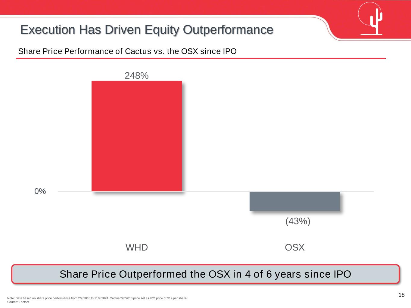 18248%(43%)IPO以来仙人掌vs. OSX的WHD OSX股价表现注:数据基于2/7/2018~11/7/2024的股价表现。Cactus 2/7/2018价格定为IPO价格每股19美元。资料来源:自IPO执行以来,Factset股价在6年中有4年跑赢OSX,推动股票跑赢表现0%