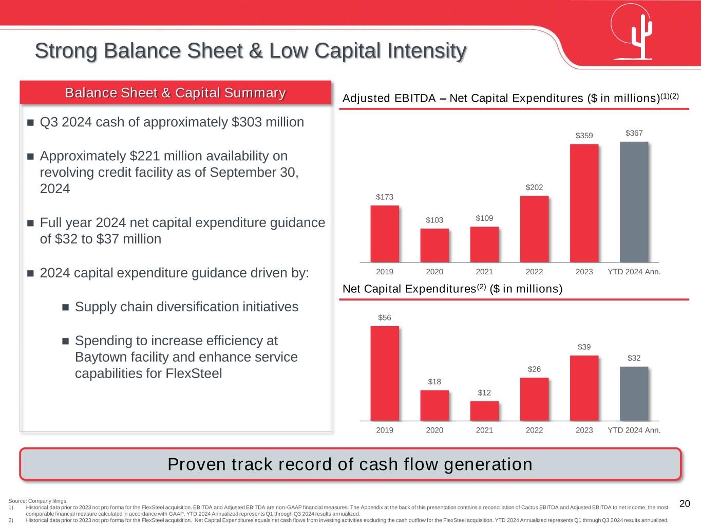 20◼2024年第三季度现金约3.03亿美元◼截至2024年9月30日循环信贷额度可用资金约为2.21亿美元◼2024年全年净资本支出指引为32至3700万美元◼推动的2024年资本支出指引:◼供应链多样化举措◼用于提高Baytown工厂效率和增强FlexSteel调整后EBITDA服务能力的支出–净资本支出(百万美元)(1)(2)产生现金流净资本支出的可靠记录(2)(百万美元)资产负债表和资本摘要来源:公司文件。1)2023年之前的历史数据不是FlexSteel收购的备考数据。EBITDA和调整后EBITDA是非公认会计准则财务指标。本演示文稿后面的附录包含仙人掌EBITDA和调整后EBITDA与净收入的对账,这是根据GAAP计算的最具可比性的财务指标。2024年年初至今年化代表2024年第一季度至第三季度业绩年化。2)2023年之前的历史数据不是FlexSteel收购的备考数据。净资本支出等于投资活动产生的净现金流,不包括收购FlexSteel的现金流出。2024年年初至今年化代表2024年第一季度至第三季度业绩年化。强劲的资产负债表和低资本密集度$ 173 $ 103 $ 109 $ 202 $ 359 $ 36720192020202120222023 YTD 2024 Ann。$ 56 $ 18 $ 12 $ 26 $ 39 $ 32 20192020202120222023 YTD 2024 Ann。