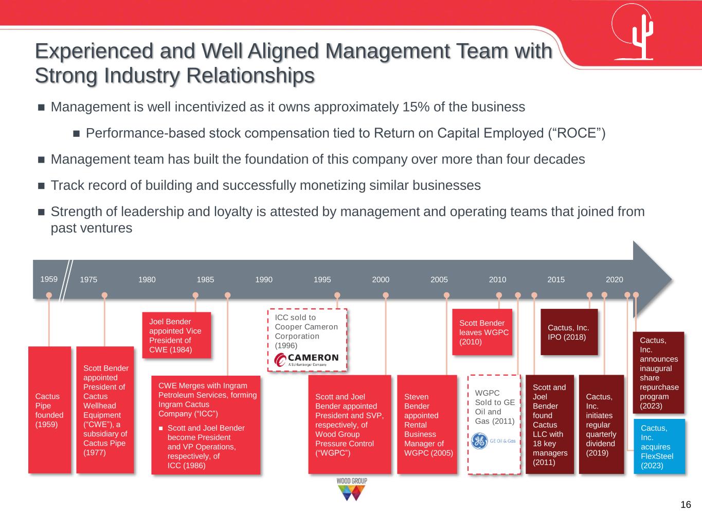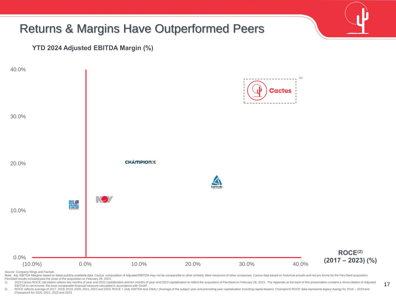 16当前◼管理层受到很好的激励,因为它拥有大约15%的业务◼与所用资本回报率(“ROCE”)挂钩的基于绩效的股票薪酬◼管理团队用四十多年的时间打造了这家公司的基础◼建立并成功将类似业务货币化的往绩记录◼领导力和忠诚度的实力得到了管理和运营团队的证明,这些团队从ICC出售给Cooper Cameron Corporation(1996)的过往企业中加入,Scott Bender被任命为Cactus井口设备(“CWE”)总裁,Cactus Pipe(1977)子公司Cactus Pipe成立(1959)CWE与英格拉姆石油服务公司合并,成立英格拉姆Cactus Company(“ICC”)◼Scott和Joel Bender分别成为ICC总裁和运营副总裁(1986)Joel Bender任命为CWE副总裁(1984)Scott和Joel Bender任命为Wood Group Pressure Control(“WGPC”)总裁和高级副总裁(SVP)Scott Bender离开WGPC(2010)Scott和Joel Bender与18名主要管理人员一起创立了Cactus LLC(2011)WGPC出售给GE Oil and Gas(2011)Steven Steven Bender任命为WGPC租赁业务经理(2005)Cactus, Inc. IPO(2018)Cactus,Inc.发起定期季度股息(2019)1980197519851990199520002005201020151959经验丰富且协调一致的管理团队与强大的行业关系2020 Cactus,Inc.收购FlexSteel(2023)Cactus,Inc.宣布首次股票回购计划(2023)