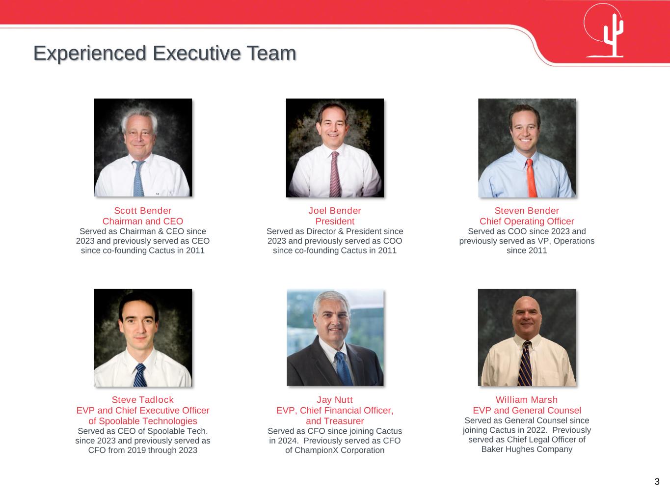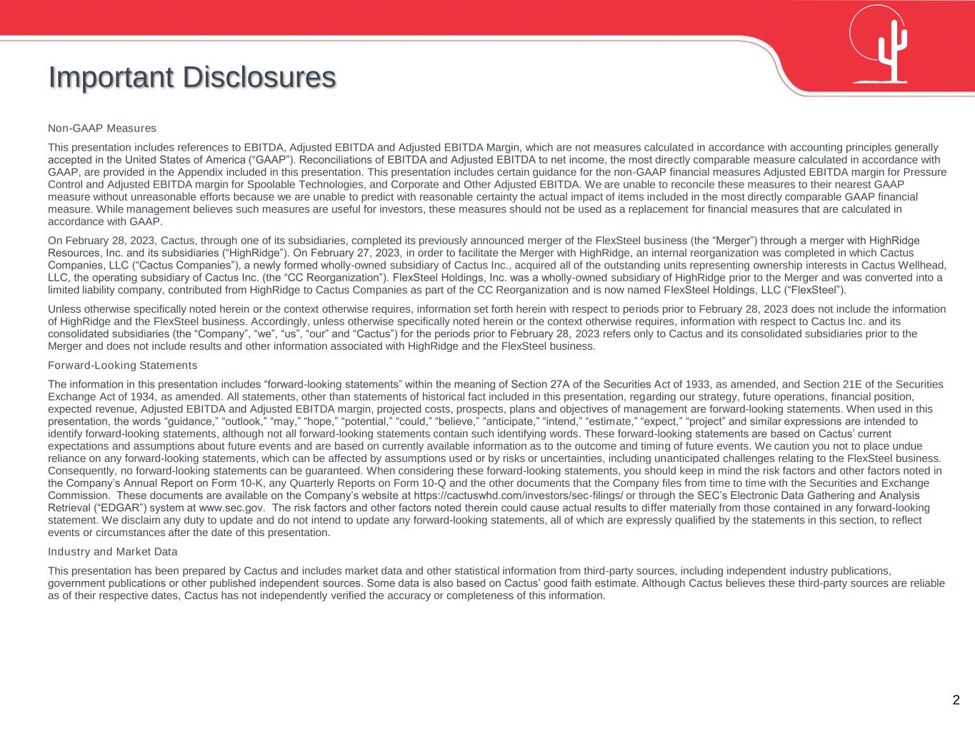 2非GAAP衡量标准本演示文稿包含对EBITDA、调整后EBITDA和调整后EBITDA利润率的引用,它们不是根据美国普遍接受的会计原则(“GAAP”)计算的衡量标准。EBITDA和调整后EBITDA与净收入的对账,这是根据公认会计原则计算的最直接可比的衡量标准,在本演示文稿的附录中提供。本演示文稿包括对压力控制的非GAAP财务指标调整后EBITDA利润率和Spoolable Technologies的调整后EBITDA利润率以及企业和其他调整后EBITDA的某些指导。我们无法在没有不合理努力的情况下将这些衡量标准与其最接近的GAAP衡量标准进行协调,因为我们无法合理确定地预测最直接可比的GAAP财务衡量标准中包含的项目的实际影响。尽管管理层认为这些措施对投资者有用,但这些措施不应被用作根据公认会计原则计算的财务措施的替代。2023年2月28日,Cactus通过其子公司之一,通过与HighRidge Resources,Inc.及其子公司(“HighRidge”)的合并,完成了此前宣布的对FlexSteel业务的合并(“合并”)。2023年2月27日,为促进与HighRidge的合并,完成了一项内部重组,其中Cactus Inc.新成立的全资子公司Cactus Companies,LLC(“Cactus Companies”)收购了Cactus Inc.的运营子公司Cactus Wellhead,LLC(“Cactus Wellhead,LLC”)中代表所有权权益的所有未偿还单位(“CC重组”)。FlexSteel Holdings,Inc.在合并前是HighRidge的全资子公司,并转变为有限责任公司,作为CC重组的一部分从HighRidge向Cactus Companies提供资金,现命名为FlexSteel Holdings,LLC(“FlexSteel”)。除非本文另有特别说明或上下文另有要求,本文所述有关2023年2月28日之前期间的信息不包括HighRidge和FlexSteel业务的信息。因此,除非本文另有特别说明或上下文另有要求,2023年2月28日之前期间有关Cactus Inc.及其合并子公司(“公司”、“我们”、“我们”、“我们的”和“Cactus”)的信息仅指合并前的Cactus及其合并子公司,不包括与HighRidge和FlexSteel业务相关的结果和其他信息。“前瞻性陈述”本演示文稿中的信息包括经修订的1933年《证券法》第27A条和经修订的1934年《证券交易法》第21E条含义内的“前瞻性陈述”。除本演示文稿中包含的历史事实陈述外,所有关于我们的战略、未来运营、财务状况、预期收入、调整后EBITDA和调整后EBITDA利润率、预计成本、前景、计划和管理层目标的陈述均为前瞻性陈述。在本演示文稿中使用时,“指导”、“展望”、“可能”、“希望”、“潜力”、“可能”、“相信”、“预期”、“打算”、“估计”、“预期”、“项目”和类似表述旨在识别前瞻性陈述,尽管并非所有前瞻性陈述都包含此类识别词。这些前瞻性陈述基于仙人掌当前对未来事件的预期和假设,并基于当前可获得的关于未来事件结果和时间的信息。我们提醒您不要过分依赖任何前瞻性陈述,这些陈述可能会受到所使用的假设或风险或不确定性的影响,包括与FlexSteel业务相关的意外挑战。因此,无法保证任何前瞻性陈述。在考虑这些前瞻性陈述时,您应该牢记公司的10-K表格年度报告、10-Q表格的任何季度报告以及公司不时向美国证券交易委员会提交的其他文件中提到的风险因素和其他因素。这些文件可在公司网站https://cactuswhd.com/investors/sec-filings/或通过SEC的电子数据收集和分析检索(“EDGAR”)系统www.sec.gov查阅。其中提到的风险因素和其他因素可能导致实际结果与任何前瞻性陈述中包含的结果存在重大差异。我们不承担任何更新的义务,也不打算更新任何前瞻性陈述,所有这些都受到本节陈述的明确限定, 以反映本演示文稿日期之后的事件或情况。行业和市场数据本演示文稿由Cactus编制,包括来自第三方来源的市场数据和其他统计信息,包括独立的行业出版物、政府出版物或其他已发布的独立来源。一些数据也是基于仙人掌的善意估计。尽管Cactus认为这些第三方来源在各自日期是可靠的,但Cactus没有独立核实这些信息的准确性或完整性。重要披露