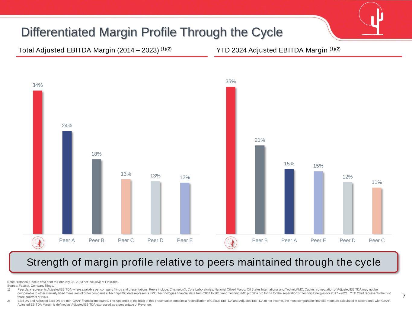 735% 21% 15% 15% 12% 11%同行B同行A同行E同行D同行C 34% 24% 18% 13% 13% 12%同行A同行B同行C同行D同行E整个周期的差异化利润率概况调整后EBITDA利润率总额(2014 – 2023)(1)(2)注:2023年2月28日之前的历史仙人掌数据不包括FlexSteel。资料来源:Factset,公司文件。1)同行数据表示根据公司文件和演示文稿可获得的调整后EBITDA。同行包括:ChampionX、核心实验室、National Oilwell Varco、石油斯特国际和TechnipFMC。Cactus对调整后EBITDA的计算可能无法与其他公司的其他类似名称的衡量标准进行比较。TechnipFMC数据代表FMC技术2014年至2016年的财务数据和TechnipFMCPLC 2017 – 2021年分离Technip Energies的备考数据。2024年初至今代表2024年前三个季度。2)EBITDA和调整后EBITDA为非GAAP财务指标。本演示文稿后面的附录包含仙人掌EBITDA和调整后EBITDA与净收入的对账,这是根据GAAP计算的最具可比性的财务指标。调整后EBITDA利润率定义为以收入百分比表示的调整后EBITDA。2024年初至今调整后EBITDA利润率(1)(2)相对于同行的利润率状况在整个周期中保持强劲