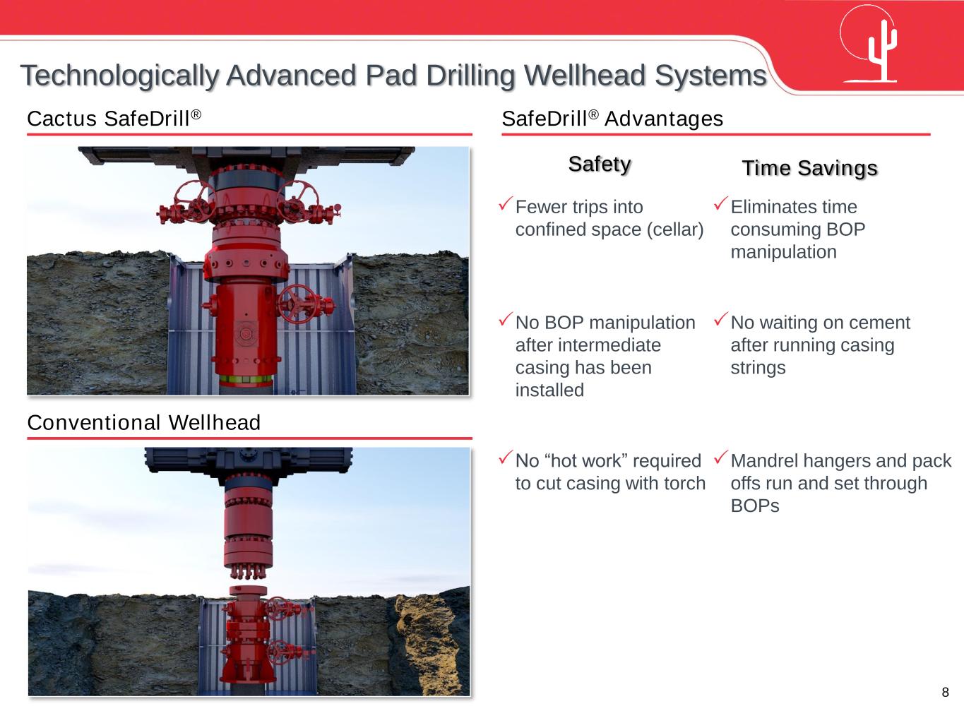 8 SafeDrill®优势技术先进的垫层钻井口系统消除了耗时的BOP操作,运行套管柱后无需等待水泥-芯轴吊架和包装脱落通过BOP运行和设置进入密闭空间(地窖)的次数更少-安装了中间套管后无需操作BOP无需“热工”使用火炬切割套管安全节省时间常规井口仙人掌SafeDrill®