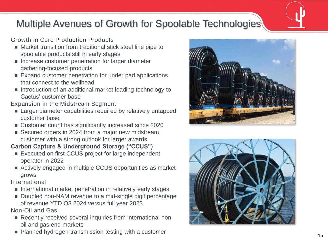 15核心生产产品增长◼市场从传统的粘钢管线管向可绕线产品过渡仍处于早期阶段◼提高以更大直径聚集为重点产品的客户渗透率◼扩大Under Pad应用的客户渗透率连接到井口的◼为仙人掌在中游细分市场的客户群扩展引入额外的市场领先技术◼相对未开发的客户群所需的更大直径能力◼自2020年以来客户数量显着增加◼2024年从一个主要的新的中游客户获得订单,该客户对更大的奖项有着强劲的前景碳捕获和地下储存(“CCUS”)◼在第一个CCUS项目上执行2022年大型独立运营商◼随着市场增长积极参与多个CCUS机会国际◼处于相对早期阶段的国际市场渗透◼与2023年全年非石油和天然气相比,2024年第三季度年初至今非NAM收入翻了一番,达到收入的中个位数百分比◼近期收到多个国际非油气终端市场询盘◼计划与客户进行氢气传输测试Spoolable Technologies的多个增长途径