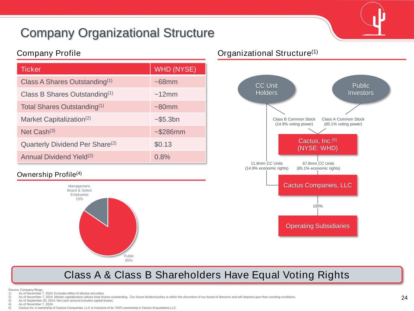 24 Public 85% Management,Board & Select Employees 15% Ownership Profile(4)公司组织Structure来源:公司文件。1)截至2024年11月7日。不包括稀释性证券的影响。2)截至2024年11月7日。市值使用已发行股份总数。我们未来的股息政策由董事会酌情决定,并将取决于当时存在的条件。3)截至2024年9月30日。现金净额包括资本租赁。4)截至2024年11月7日。5)Cactus Inc.对Cactus Companies,LLC的所有权包括其对Cactus Acquisitions LLC的100%所有权。CC单位持有人公众投资者Cactus, Inc.(5)(NYSE:WHD)Cactus Companies,LLC运营子公司股票代码WHD(NYSE)A类流通股(1)~68mm B类流通股(1)~12mm已发行总股份(1)~80mm市值(2)~53亿美元净现金(3)~286mm季度每股股息(2)0.13美元年股息收益率(2)0.8%公司简介组织结构Structure(1)A类普通股(85.1%投票权)B类普通股(14.9%投票权)11.8mm CC单位(14.9%经济权)67.8mm CC单位(85.1%经济权)100% A类& B类股东拥有同等投票权