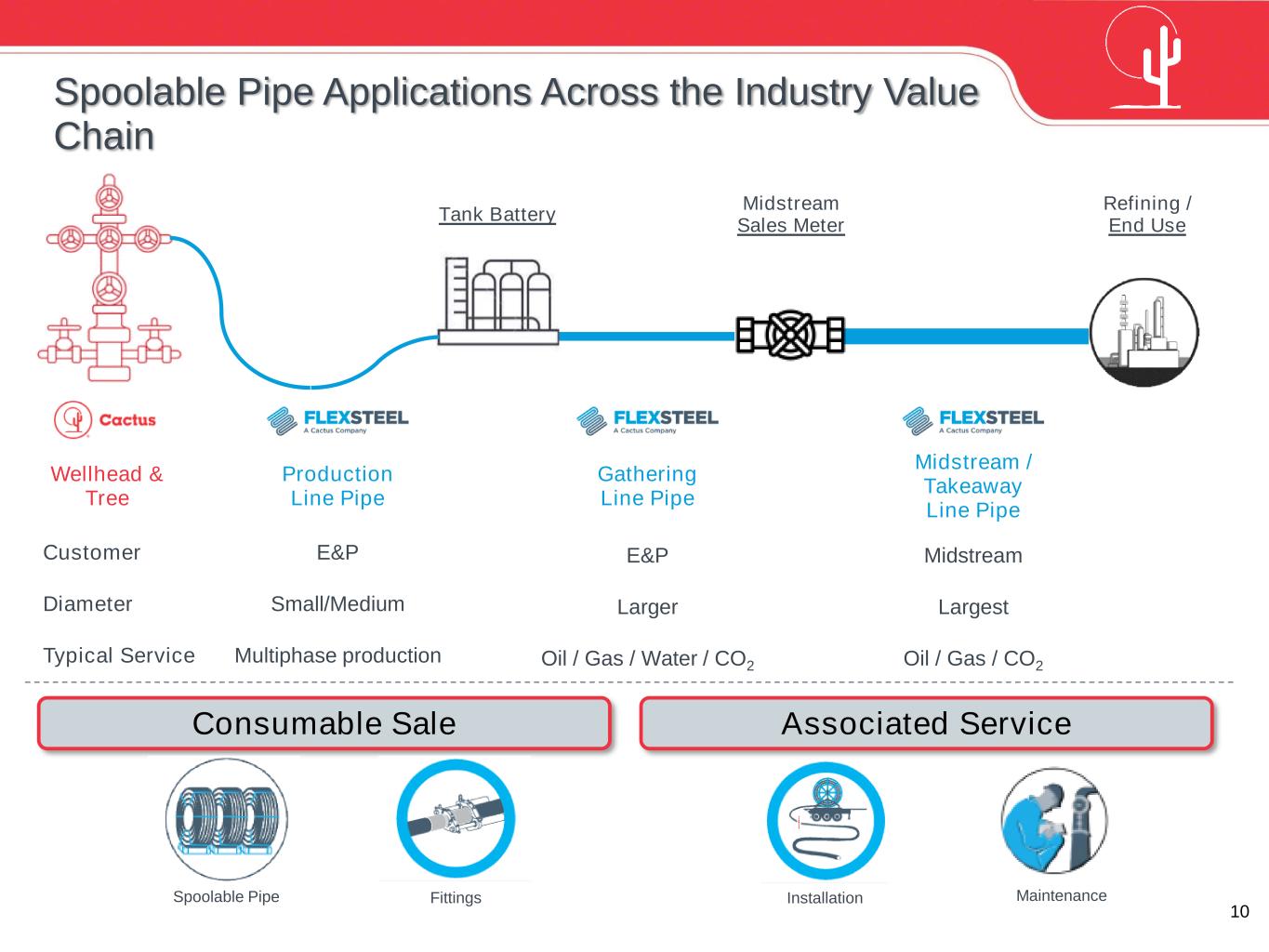 10款可弯管应用横跨行业价值链罐体电池井口&树中游销售仪表精制/终端用途生产线集管线管中游/外卖线管客户直径典型服务E & P小/中多相生产E & P较大石油/天然气/水/CO2中游最大石油/天然气/CO2耗材销售可弯管相关服务配件安装维护
