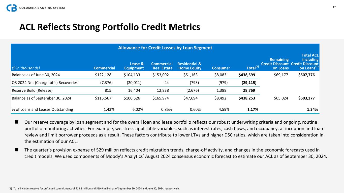 ACL反映了强劲的投资组合信用指标(1)总额包括截至2024年9月30日和2024年6月30日分别为1820万美元和1990万美元的无资金承诺准备金。17 ■我们按贷款分部以及对整体贷款和租赁组合的准备金覆盖率反映了我们稳健的承销标准和持续的、例行的投资组合监测活动。例如,我们在开始和贷款审查时强调适用的变量,例如利率、现金流和占用,并因此限制借款人收益。这些因素导致较低的LTV和较高的DSC比率,这在我们的ACL估计中被考虑在内。■本季度2900万美元的拨备费用反映了信贷迁移趋势、冲销活动以及信贷模型中使用的经济预测的变化。我们使用了Moody’s Analytics的2024年8月一致经济预测的组成部分来估计我们截至2024年9月30日的ACL。按贷款分部划分的信贷损失准备金(单位:千美元)商业租赁和设备商业房地产住宅和房屋净值消费者总额(1)贷款剩余信贷折扣总额ACL,包括贷款信贷折扣(1)截至2024年6月30日的余额$ 122,128 $ 104,133 $ 153,092 $ 51,163 $ 8,083 $ 438,599 $ 69,177 $ 507,7762024年第三季度净(冲销)回收(7,376)(20,011)44(793)(979)(29,115)储备建立(释放)81516,40412,838(2,676)1,38828,769截至2024年9月30日的余额$ 115,567 $ 100,526 $ 165,974 $ 47,694 $ 8,492 $ 438,253 $ 65,024 $ 50
