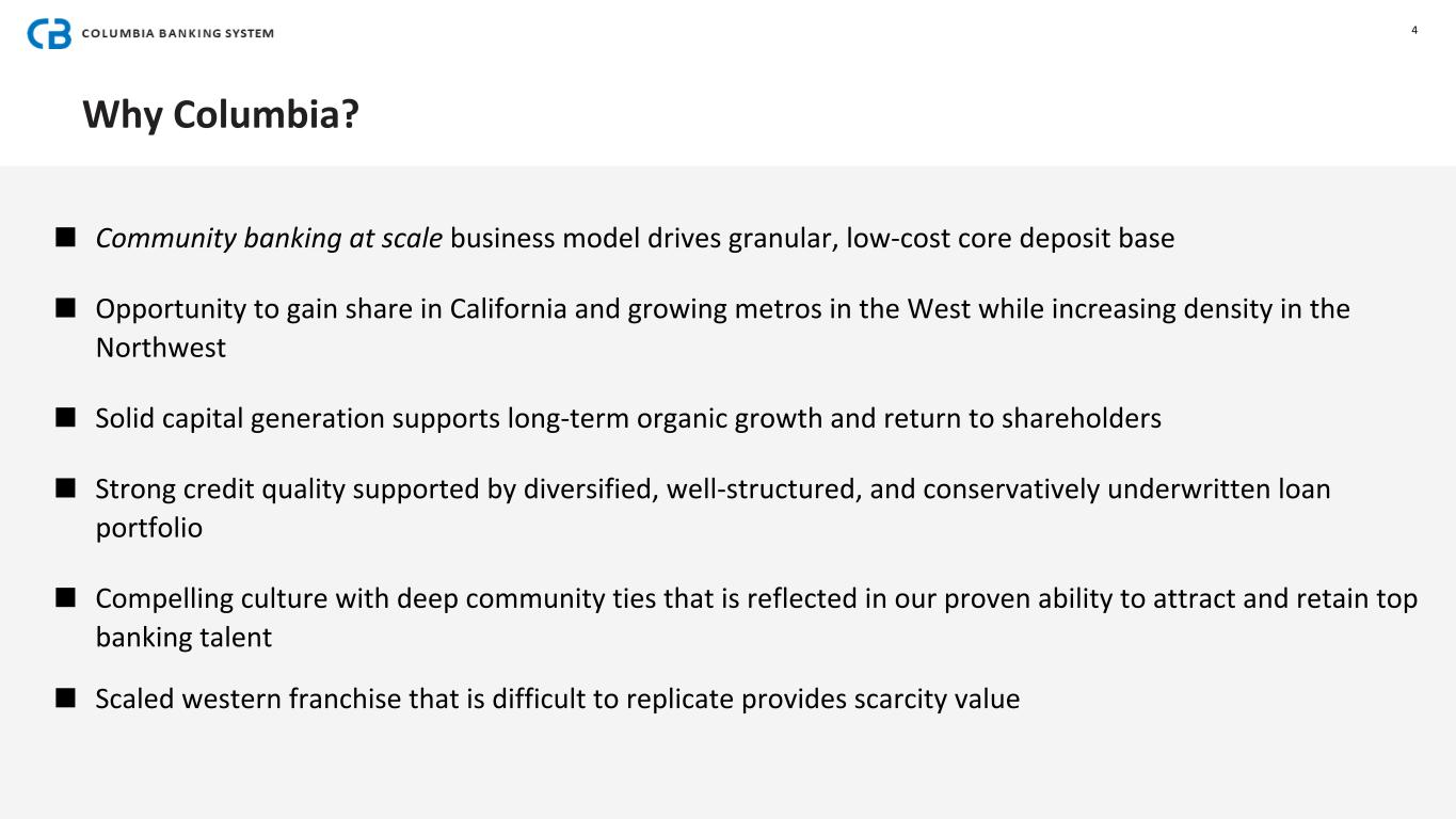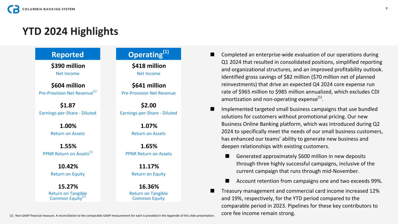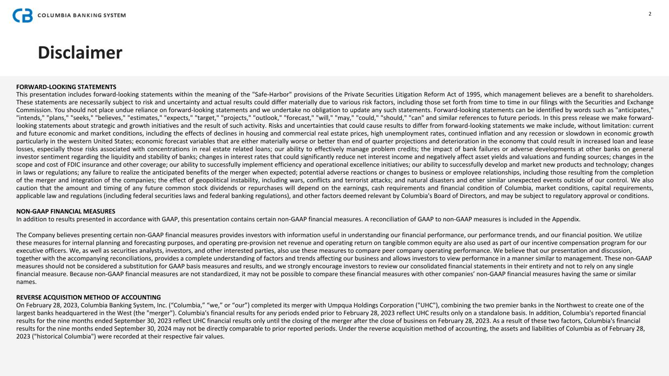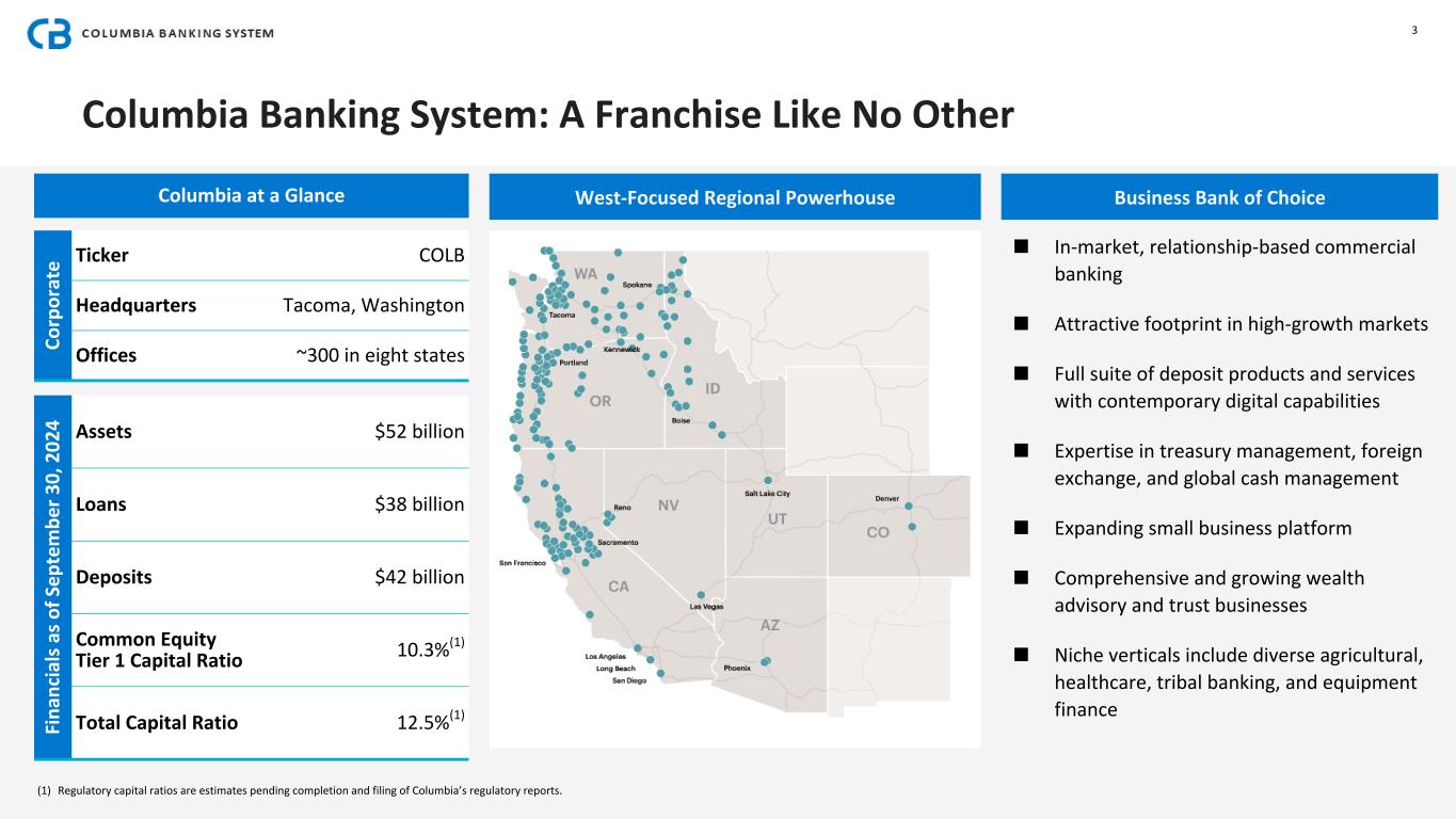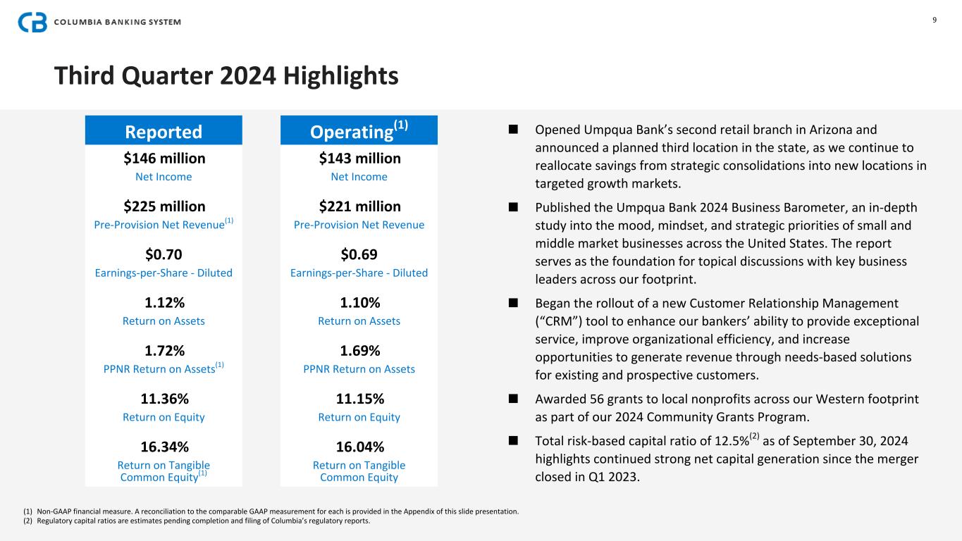 免责声明前瞻性陈述本演示文稿包含1995年《私人证券诉讼改革法案》“安全港”条款含义内的前瞻性陈述,管理层认为这对股东有利。这些陈述必然受到风险和不确定性的影响,实际结果可能因各种风险因素而存在重大差异,包括我们向美国证券交易委员会提交的文件中不时列出的风险因素。您不应过分依赖前瞻性陈述,我们不承担更新任何此类陈述的义务。前瞻性陈述可以通过诸如“预期”、“打算”、“计划”、“寻求”、“相信”、“估计”、“预期”、“目标”、“项目”、“展望”、“预测”、“将”、“可能”、“可能”、“应该”、“可以”等词语以及对未来期间的类似提及来识别。在本新闻稿中,我们就战略和增长举措以及此类活动的结果做出前瞻性陈述。可能导致结果与我们做出的前瞻性陈述不同的风险和不确定性包括但不限于:当前和未来的经济和市场状况,包括住房和商业房地产价格下跌、高失业率、持续的通货膨胀以及经济增长的任何衰退或放缓的影响,尤其是在美国西部;经济预测变量要么实质上比季度末的预测更差或更好,要么经济恶化可能导致贷款和租赁损失增加,尤其是那些与房地产相关贷款集中相关的风险;我们有效管理问题信贷的能力;银行倒闭或其他银行的不利发展对投资者关于银行流动性和稳定性的一般情绪的影响;利率的变化这可能会显着降低净利息收入,并对资产收益率、估值和资金来源产生负面影响;FDIC保险和其他保险范围和成本的变化;我们成功实施效率和卓越运营举措的能力;我们成功开发和营销新产品和技术的能力;法律或法规的变化;任何未能在预期时实现合并的预期收益;对业务或员工关系的潜在不利反应或变化,包括那些因公司完成合并和整合而导致的反应或变化;地缘政治不稳定的影响,包括战争,冲突和恐怖袭击;以及自然灾害和我们无法控制的其他类似突发事件。我们还提醒,未来任何普通股股息或回购的金额和时间将取决于哥伦比亚的收益、现金需求和财务状况、市场状况、资本要求、适用的法律法规(包括联邦证券法和联邦银行法规),以及哥伦比亚董事会认为相关的其他因素,并可能受到监管部门的批准或条件的限制。非公认会计准则财务指标除了根据公认会计准则列报的结果外,本演示文稿还包含某些非公认会计准则财务指标。GAAP与非GAAP措施的对账包含在附录中。该公司认为,提供某些非公认会计准则财务指标可为投资者提供有用的信息,以了解我们的财务业绩、我们的业绩趋势和我们的财务状况。我们将这些措施用于内部规划和预测目的,运营拨备前净收入和有形普通股的运营回报率也被用作我们对执行官的激励薪酬计划的一部分。我们,以及证券分析师、投资者、其他利益相关方,也用这些衡量标准来比较同行公司的经营业绩。我们相信,我们的介绍和讨论,连同伴随的对账,提供了对影响我们业务的因素和趋势的完整理解,并允许投资者以类似于管理层的方式看待业绩。这些非GAAP衡量标准不应被视为替代GAAP基础衡量标准和结果,我们强烈鼓励投资者全面审查我们的合并财务报表,不要依赖任何单一的财务衡量标准。由于非GAAP财务指标不标准化,可能无法将这些财务指标与名称相同或相似的其他公司的非GAAP财务指标进行比较。反向收购会计法于2023年2月28日,Columbia Banking System, Inc.(“Columbia”、“我们”或“我们的”)完成与Umpqua Holdings Corporation(“UHC”)的合并, 将西北地区两家首屈一指的银行合并,创建总部设在西部的最大银行之一(“合并”)。Columbia截至2023年2月28日之前的任何期间的财务业绩仅在独立基础上反映UHC业绩。此外,Columbia报告的截至2023年9月30日止九个月的财务业绩仅反映UHC的财务业绩,直至2023年2月28日营业结束后合并完成。由于这两个因素,哥伦比亚截至2024年9月30日的九个月的财务业绩可能无法与之前的报告期间直接比较。在逆向取得会计法下,Columbia截至2023年2月28日的资产和负债(“历史上的Columbia”)按其各自的公允价值入账。2