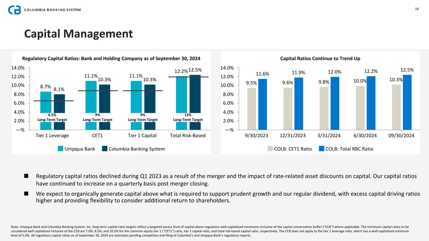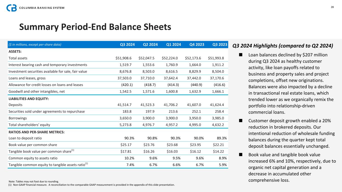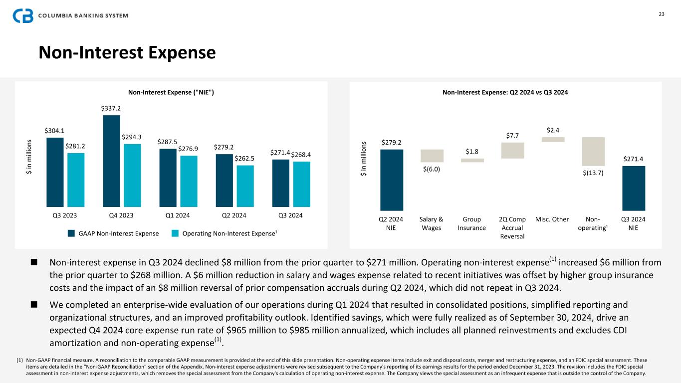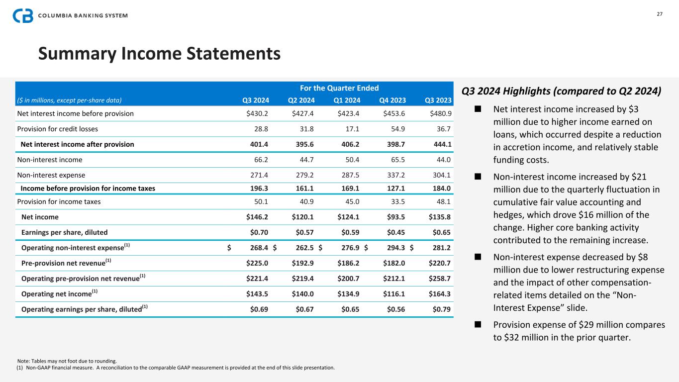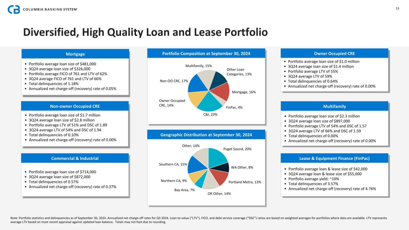 免责声明前瞻性陈述本演示文稿包含1995年《私人证券诉讼改革法案》“安全港”条款含义内的前瞻性陈述,管理层认为这对股东有利。这些陈述必然受到风险和不确定性的影响,实际结果可能因各种风险因素而存在重大差异,包括我们向美国证券交易委员会提交的文件中不时列出的风险因素。您不应过分依赖前瞻性陈述,我们不承担更新任何此类陈述的义务。前瞻性陈述可以通过诸如“预期”、“打算”、“计划”、“寻求”、“相信”、“估计”、“预期”、“目标”、“项目”、“展望”、“预测”、“将”、“可能”、“可能”、“应该”、“可以”等词语以及对未来期间的类似提及来识别。在本新闻稿中,我们就战略和增长举措以及此类活动的结果做出前瞻性陈述。可能导致结果与我们做出的前瞻性陈述不同的风险和不确定性包括但不限于:当前和未来的经济和市场状况,包括住房和商业房地产价格下跌、高失业率、持续的通货膨胀以及经济增长的任何衰退或放缓的影响,尤其是在美国西部;经济预测变量要么实质上比季度末的预测更差或更好,要么经济恶化可能导致贷款和租赁损失增加,尤其是那些与房地产相关贷款集中相关的风险;我们有效管理问题信贷的能力;银行倒闭或其他银行的不利发展对投资者关于银行流动性和稳定性的一般情绪的影响;利率的变化这可能会显着降低净利息收入,并对资产收益率、估值和资金来源产生负面影响;FDIC保险和其他保险范围和成本的变化;我们成功实施效率和卓越运营举措的能力;我们成功开发和营销新产品和技术的能力;法律或法规的变化;任何未能在预期时实现合并的预期收益;对业务或员工关系的潜在不利反应或变化,包括那些因公司完成合并和整合而导致的反应或变化;地缘政治不稳定的影响,包括战争,冲突和恐怖袭击;以及自然灾害和我们无法控制的其他类似突发事件。我们还提醒,未来任何普通股股息或回购的金额和时间将取决于哥伦比亚的收益、现金需求和财务状况、市场状况、资本要求、适用的法律法规(包括联邦证券法和联邦银行法规),以及哥伦比亚董事会认为相关的其他因素,并可能受到监管部门的批准或条件的限制。非公认会计准则财务指标除了根据公认会计准则列报的结果外,本演示文稿还包含某些非公认会计准则财务指标。GAAP与非GAAP措施的对账包含在附录中。该公司认为,提供某些非公认会计准则财务指标可为投资者提供有用的信息,以了解我们的财务业绩、我们的业绩趋势和我们的财务状况。我们将这些措施用于内部规划和预测目的,运营拨备前净收入和有形普通股的运营回报率也被用作我们对执行官的激励薪酬计划的一部分。我们,以及证券分析师、投资者、其他利益相关方,也用这些衡量标准来比较同行公司的经营业绩。我们相信,我们的介绍和讨论,连同伴随的对账,提供了对影响我们业务的因素和趋势的完整理解,并允许投资者以类似于管理层的方式看待业绩。这些非GAAP衡量标准不应被视为替代GAAP基础衡量标准和结果,我们强烈鼓励投资者全面审查我们的合并财务报表,不要依赖任何单一的财务衡量标准。由于非GAAP财务指标不标准化,可能无法将这些财务指标与名称相同或相似的其他公司的非GAAP财务指标进行比较。反向收购会计法于2023年2月28日,Columbia Banking System, Inc.(“Columbia”、“我们”或“我们的”)完成与Umpqua Holdings Corporation(“UHC”)的合并, 将西北地区两家首屈一指的银行合并,创建总部设在西部的最大银行之一(“合并”)。Columbia截至2023年2月28日之前的任何期间的财务业绩仅在独立基础上反映UHC业绩。此外,Columbia报告的截至2023年9月30日止九个月的财务业绩仅反映UHC的财务业绩,直至2023年2月28日营业结束后合并完成。由于这两个因素,哥伦比亚截至2024年9月30日的九个月的财务业绩可能无法与之前的报告期间直接比较。在逆向取得会计法下,Columbia截至2023年2月28日的资产和负债(“历史上的Columbia”)按其各自的公允价值入账。2