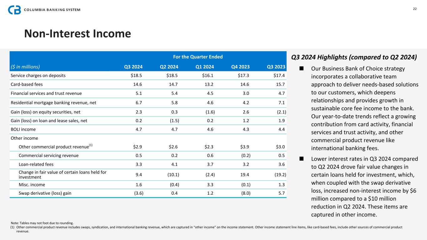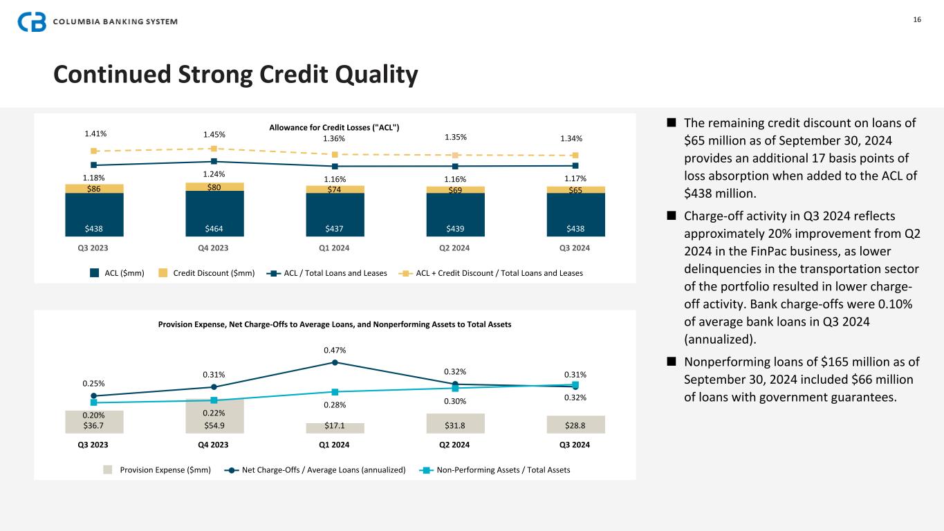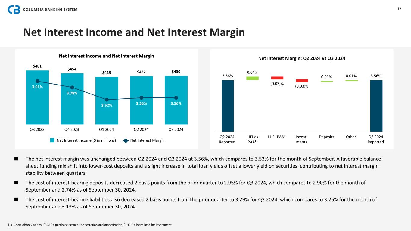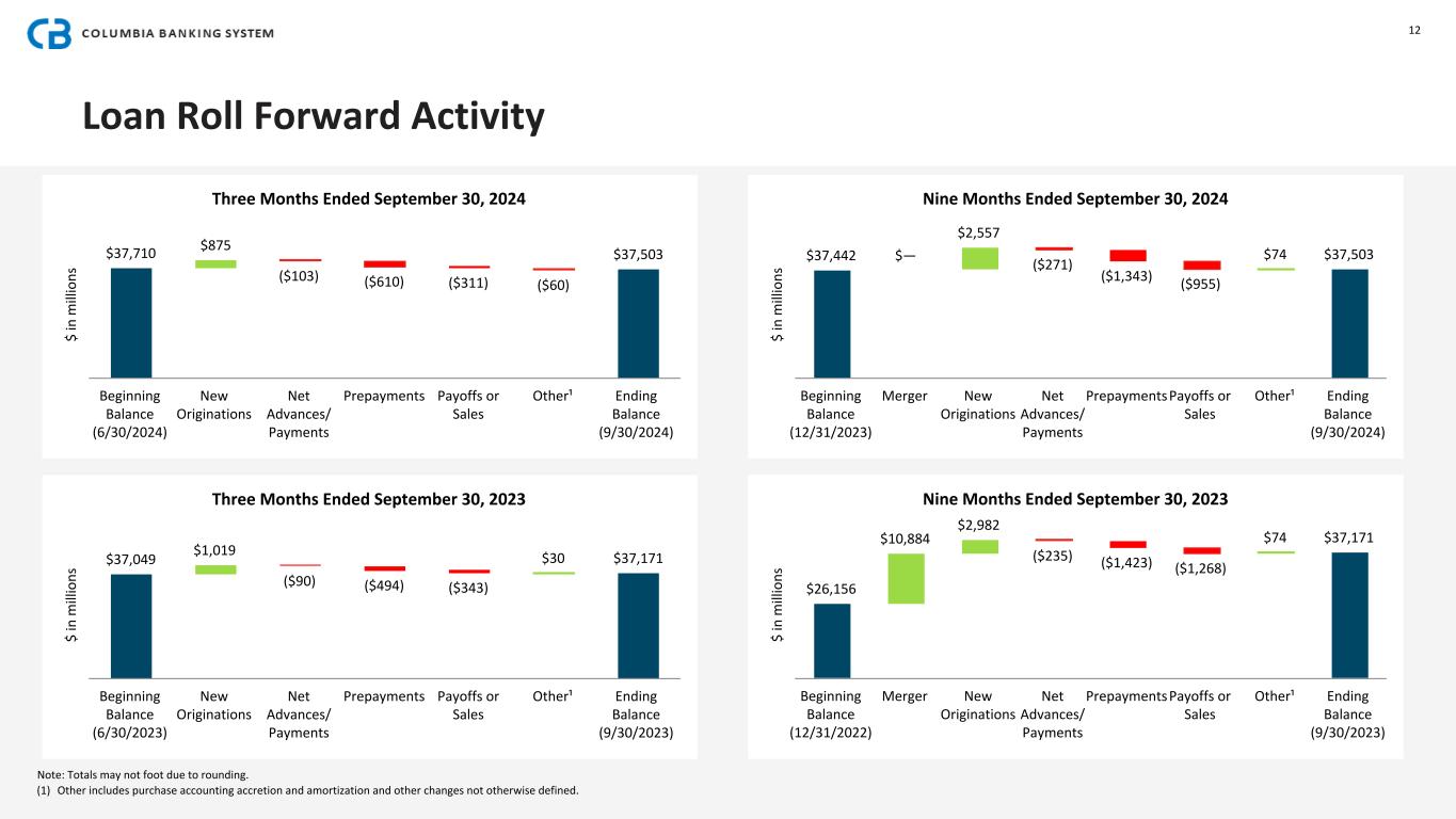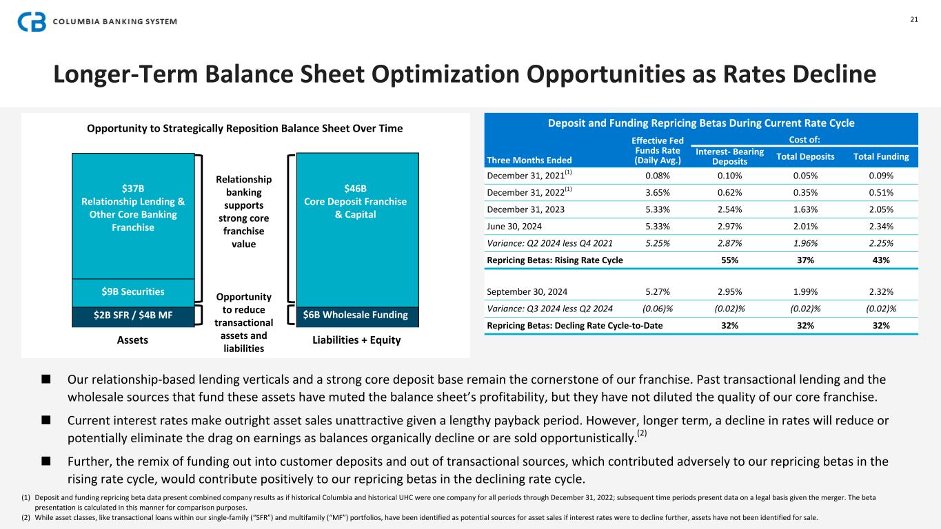 免责声明前瞻性陈述本演示文稿包含1995年《私人证券诉讼改革法案》“安全港”条款含义内的前瞻性陈述,管理层认为这对股东有利。这些陈述必然受到风险和不确定性的影响,实际结果可能因各种风险因素而存在重大差异,包括我们向美国证券交易委员会提交的文件中不时列出的风险因素。您不应过分依赖前瞻性陈述,我们不承担更新任何此类陈述的义务。前瞻性陈述可以通过诸如“预期”、“打算”、“计划”、“寻求”、“相信”、“估计”、“预期”、“目标”、“项目”、“展望”、“预测”、“将”、“可能”、“可能”、“应该”、“可以”等词语以及对未来期间的类似提及来识别。在本新闻稿中,我们就战略和增长举措以及此类活动的结果做出前瞻性陈述。可能导致结果与我们做出的前瞻性陈述不同的风险和不确定性包括但不限于:当前和未来的经济和市场状况,包括住房和商业房地产价格下跌、高失业率、持续的通货膨胀以及经济增长的任何衰退或放缓的影响,尤其是在美国西部;经济预测变量要么实质上比季度末的预测更差或更好,要么经济恶化可能导致贷款和租赁损失增加,尤其是那些与房地产相关贷款集中相关的风险;我们有效管理问题信贷的能力;银行倒闭或其他银行的不利发展对投资者关于银行流动性和稳定性的一般情绪的影响;利率的变化这可能会显着降低净利息收入,并对资产收益率、估值和资金来源产生负面影响;FDIC保险和其他保险范围和成本的变化;我们成功实施效率和卓越运营举措的能力;我们成功开发和营销新产品和技术的能力;法律或法规的变化;任何未能在预期时实现合并的预期收益;对业务或员工关系的潜在不利反应或变化,包括那些因公司完成合并和整合而导致的反应或变化;地缘政治不稳定的影响,包括战争,冲突和恐怖袭击;以及自然灾害和我们无法控制的其他类似突发事件。我们还提醒,未来任何普通股股息或回购的金额和时间将取决于哥伦比亚的收益、现金需求和财务状况、市场状况、资本要求、适用的法律法规(包括联邦证券法和联邦银行法规),以及哥伦比亚董事会认为相关的其他因素,并可能受到监管部门的批准或条件的限制。非公认会计准则财务指标除了根据公认会计准则列报的结果外,本演示文稿还包含某些非公认会计准则财务指标。GAAP与非GAAP措施的对账包含在附录中。该公司认为,提供某些非公认会计准则财务指标可为投资者提供有用的信息,以了解我们的财务业绩、我们的业绩趋势和我们的财务状况。我们将这些措施用于内部规划和预测目的,运营拨备前净收入和有形普通股的运营回报率也被用作我们对执行官的激励薪酬计划的一部分。我们,以及证券分析师、投资者、其他利益相关方,也用这些衡量标准来比较同行公司的经营业绩。我们相信,我们的介绍和讨论,连同伴随的对账,提供了对影响我们业务的因素和趋势的完整理解,并允许投资者以类似于管理层的方式看待业绩。这些非GAAP衡量标准不应被视为替代GAAP基础衡量标准和结果,我们强烈鼓励投资者全面审查我们的合并财务报表,不要依赖任何单一的财务衡量标准。由于非GAAP财务指标不标准化,可能无法将这些财务指标与名称相同或相似的其他公司的非GAAP财务指标进行比较。反向收购会计法于2023年2月28日,Columbia Banking System, Inc.(“Columbia”、“我们”或“我们的”)完成与Umpqua Holdings Corporation(“UHC”)的合并, 将西北地区两家首屈一指的银行合并,创建总部设在西部的最大银行之一(“合并”)。Columbia截至2023年2月28日之前的任何期间的财务业绩仅在独立基础上反映UHC业绩。此外,Columbia报告的截至2023年9月30日止九个月的财务业绩仅反映UHC的财务业绩,直至2023年2月28日营业结束后合并完成。由于这两个因素,哥伦比亚截至2024年9月30日的九个月的财务业绩可能无法与之前的报告期间直接比较。在逆向取得会计法下,Columbia截至2023年2月28日的资产和负债(“历史上的Columbia”)按其各自的公允价值入账。2