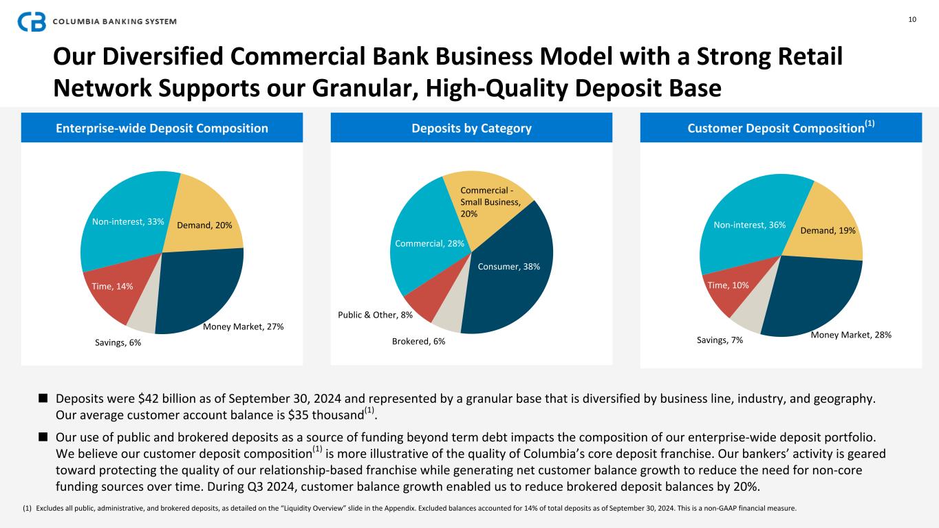 2024年第三季度亮点9 ■ Umpqua银行在亚利桑那州开设了第二家零售分行,并宣布计划在该州设立第三家分行,因为我们将继续将战略整合带来的储蓄重新分配到目标增长市场的新地点。■发布了Umpqua银行2024年商业晴雨表,深入研究了美国各地中小型市场企业的情绪、心态和战略优先事项。该报告是与我们足迹上的关键商业领袖进行主题讨论的基础。■开始推出新的客户关系管理(“CRM”)工具,以增强我们的银行家提供卓越服务的能力,提高组织效率,并增加通过基于需求的解决方案为现有和潜在客户创造收入的机会。■作为2024年社区赠款计划的一部分,向我们西部足迹的当地非营利组织授予了56笔赠款。■截至2024年9月30日,基于风险的总资本比率为12.5%(2),这凸显了自2023年第一季度合并完成以来持续强劲的净资本生成。报告经营(1)1.46亿美元1.43亿美元净收入2.25亿美元2.21亿美元拨备前净收入(1)拨备前净收入0.70美元0.69美元每股收益-稀释每股收益-稀释后1.12% 1.10%资产收益率资产收益率1.72% 1.69% PPNR资产收益率(1)PPNR资产收益率11.36% 11.15%股本收益率16.34% 16.04%有形普通股收益率(1)有形普通股收益率(1)非公认会计准则财务计量。本幻灯片演示的附录中提供了与每一项可比GAAP衡量标准的对账。(2)监管资本比率是在完成和提交哥伦比亚监管报告之前的估计。
