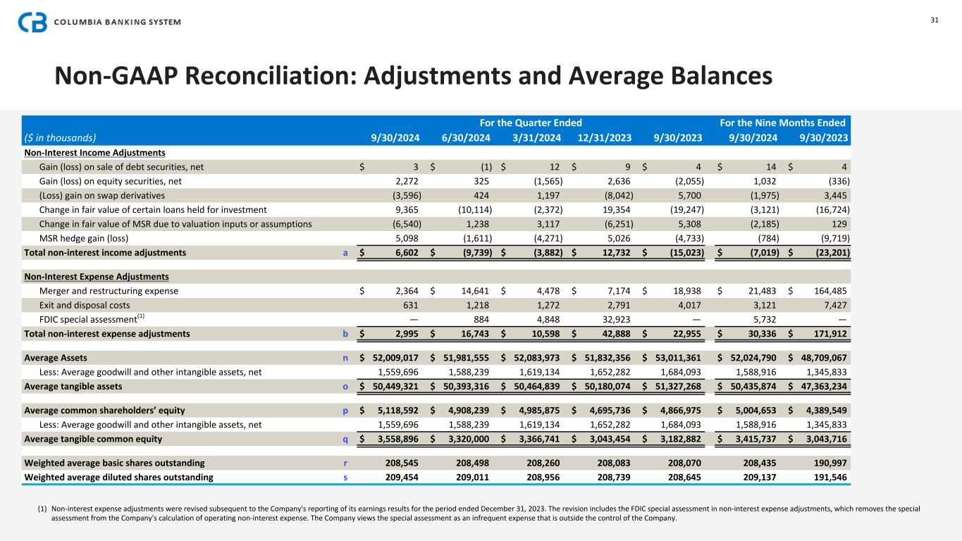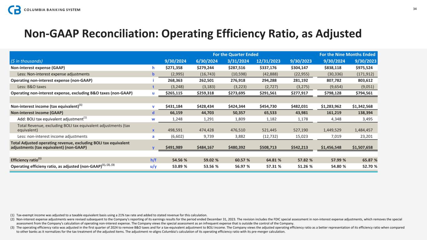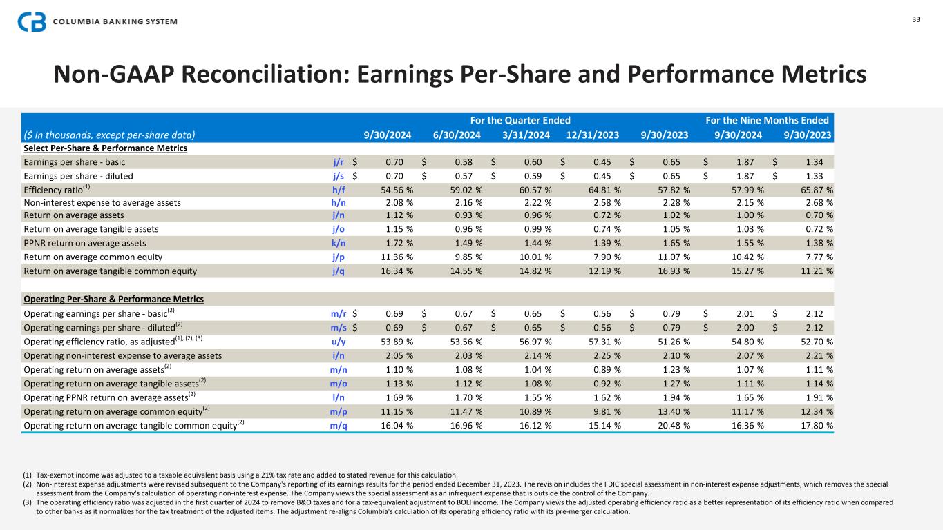 非美国通用会计准则对账:截至9个月的季度每股收益和业绩指标(单位:千美元,每股数据除外)9/30/20246/30/20243/31/202412/31/20239/30/20239/30/20239/30/20249/30/2023 Select per Share & Performance Metrics Earnings per share-basic j/r $ 0.70 $ 0.58 $ 0.60 $ 0.45 $ 0.65 $ 1.87 $ 1.34 Earnings per share-dilted j/s $ 0.70 $ 0.57 $ 0.59 $ 0.45 $ 0.65 $ 1.87 $ 1.33 Efficiency ratio(1)h/f 54.56% 59.02% 60.57% 64.81% 57.82% 57.99% 65.87% Non-interest expense to average assets h/n 2.08% 2.16% 2.22% 2.58% 2.28% 2.15% 2.68%平均资产收益率j/n% 0.96% 0.72% 1.02% 1.00% 0.70%平均有形资产收益率j/o1.15 % 0.96% 0.99% 0.74% 1.05% 1.03% 0.72% PPNR平均资产收益率k/n 1.72% 1.49% 1.44% 1.39% 1.65% 1.55% 1.38%平均普通股权益收益率j/p 11.36% 9.85% 10.85% 7.90% 11.07% 10.42% 7.77%平均有形普通股权益收益率j/q 16.34% 14.55% 14.82% 12.19% 16.93% 15.27% 11.21%每股经营业绩指标营业利润每股-基本(2)m/r $ 0.69 $ 0.67 $ 0.65 $ 0.56 $ 0.79 $ 2.01 $ 2.12每股运营收益-稀释后(2)m/s $ 0.69 $ 0.67 $ 0.65 $ 0.56 $ 0.79 $ 2.00 $ 2.12经调整后的运营效率比率(1),(2),(3)u/y 53.89% 53.56% 56.97% 57.31% 51.26% 54.80% 52.70%经营性非利息费用比平均资产i/n 2.05% 2.03% 2.14% 2.25% 2.10% 2.07% 2.21%经营性平均资产收益率(2)m/n 1.10% 1.08% 1.04% 0.89% 1.23% 1.07% 1.11%经营性平均有形资产收益率(2)m/o 1.13% 1.12% 1.08% 0.92% 1.27% 1.11% 1.14%经营性PPNR平均资产收益率(2)l/n 1.69% 1.70% 1.55% 1.62% 1.94% 1.65% 1.91%经营性平均普通股权益回报率(2)m/p 11.15% 11.47% 10.89% 9.81% 13.40% 11.17% 12.34%平均有形普通股权益经营回报率(2)m/q 16.04% 16.96% 16.12% 15.14% 20.48% 16.36% 17.80%(1)免税收入采用21%的税率调整为应税等值基础,并为此计算加入申报收入。(2)非利息费用调整在公司报告截至2023年12月31日止期间的收益结果后进行了修订。此次修订将FDIC特别评估纳入非利息费用调整,将特别评估从公司计算的经营性非利息费用中删除。公司认为特别评估是一项不经常发生的费用,不在公司控制范围内。(3)运营效率比率在2024年第一季度进行了调整,以去除B & O税,并对BOLI收入进行了税收等价调整。由于调整后项目的税务处理正常化,公司将调整后的经营效率比率视为与其他银行相比更好地代表其效率比率。此次调整使哥伦比亚对其运营效率比率的计算与合并前的计算重新保持一致。33
