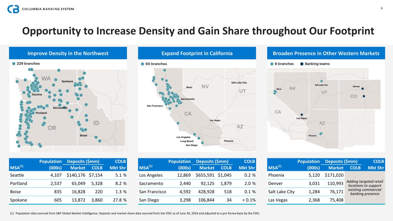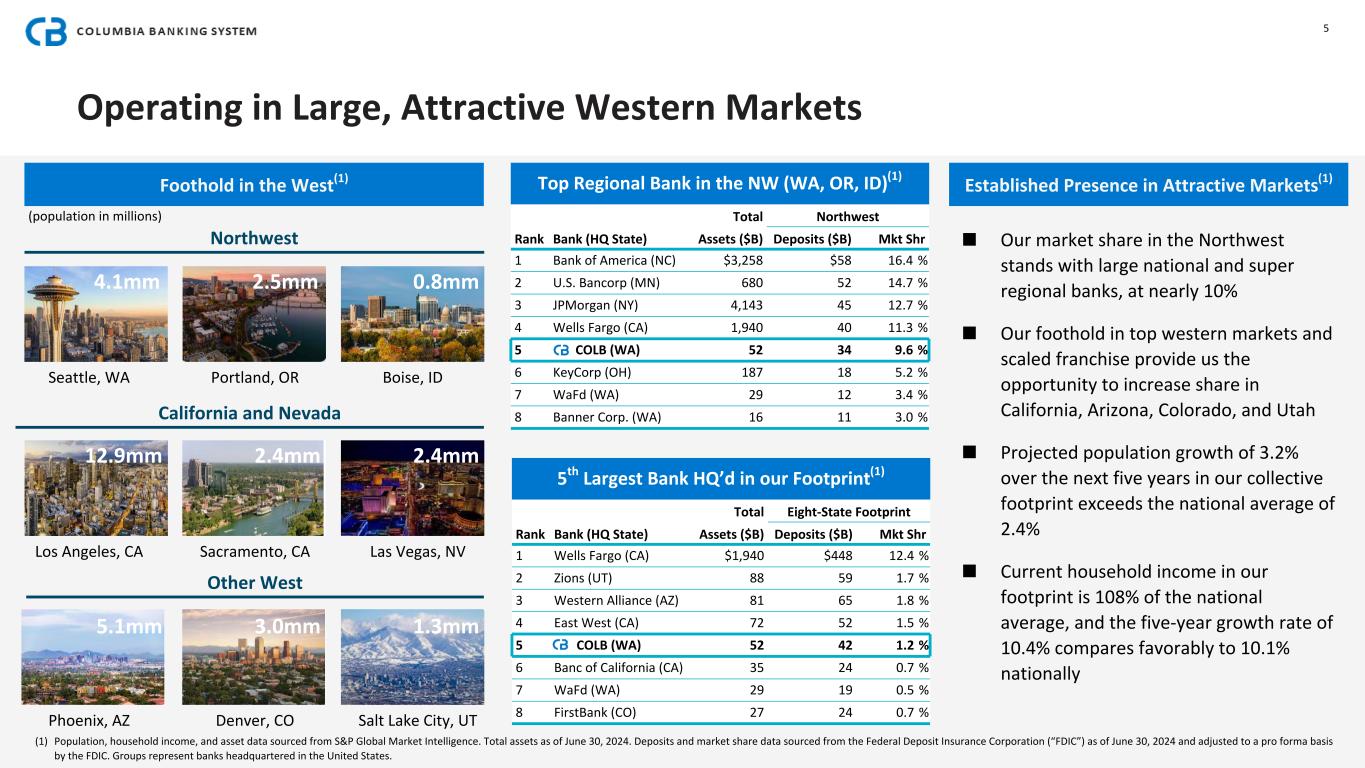 在大型、有吸引力的西部市场经营5个据点在西部(1)西北部(百万人口)华盛顿州波特兰的西雅图,或加利福尼亚州和内华达州的洛杉矶、加利福尼亚州萨克拉门托、加利福尼亚州其他西凤凰城、亚利桑那州丹佛市、美国西北部(WA)的CO 4.1mm 2.5mm 12.9mm 2.4mm 5.1mm 3.0mm地区银行(WA,或,ID)(1)Northwest Rank Bank(HQ State)Total Assets($ B)Deposits($ B)MKT SHR 1 Bank of America(NC)$ 3,258 $ 58 16.4% 2 美国合众银行(MN)6805214.7% 3 JPMorgan(NY)4,1434512.7% 4 富国银行(加利福尼亚州)1,9404011.3% 5 COLBTERM3(WA)52349.6% 6 KeyCorp(OH)187185.2% 7 WaFd(WA)29123.4% 8 邦纳 Corp.(WA)16113.0% 5th Largest Bank HQ'd in our footprint(1)Total eight-State footprint Rank Bank(HQ State)Assets($ B)Deposits($ B)MK12.4% 2 Zions(UT)88591.7% 3 Western Alliance(AZ)81651.8% 4 East West(加利福尼亚州)72521.5% 5 TERMB(WA)52421.2% 6 加州银行(加利福尼亚州)35240.7% 7 WaFd(WA)29190.5% 8 FirstBank(CO)27240.7%在有吸引力的市场建立了存在(1)■我们在西北地区的市场份额与大型全国性和超级区域性银行并驾齐驱,接近10% ■我们在顶级西部市场的立足点和规模化的特许经营权为我们提供了在加利福尼亚州亚利桑那州增加份额的机会,科罗拉多州和犹他州■预计未来五年我们集体足迹中的人口增长率为3.2%,超过了2.4%的全国平均水平■目前我们足迹中的家庭收入是全国平均水平的108%,10.4%的五年增长率优于全国的10.1%。博伊西、ID盐湖城、犹他州拉斯维加斯、内华达州0.8mm 2.4mm 1.3mm(1)人口、家庭收入和资产数据来自标普全球市场情报。截至2024年6月30日的总资产。存款和市场份额数据来自美国联邦存款保险公司(“FDIC”),截至2024年6月30日,经FDIC调整为备考基础。集团代表总部设在美国的银行。