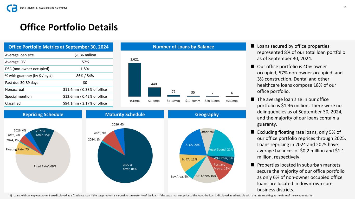 C & I和CRE投资组合构成农业、9.2%承包商、7.7%金融/保险、7.6%制造业、7.2%专业、3.8%公共管理、6.3%租赁和租赁、6.3%零售、2.7%支持服务、4.8%运输/仓储、7.9%批发、6.6%博彩、5.6%牙医、7.1%其他医疗、4.4%其他、12.8%办公、16.3%多户家庭、33.4%工业、15.9%零售、11.4%特殊用途、7.5%酒店/汽车旅馆、4.2%其他、11.4% CRE投资组合构成(1)截至2024年9月30日为174亿美元C & I投资组合构成(1)截至2024年9月30日为97亿美元(1)C & I投资组合构成包括期限、信贷额度和其他以及租赁和设备融资余额。CRE投资组合构成包括非业主占用期限和业主占用期限余额以及多户家庭余额。(2)自住和非自住披露涉及商业地产组合,不包括多户贷款。45%业主占用/55%非业主占用(2)2024年9月30日商业线路利用率为37% 14