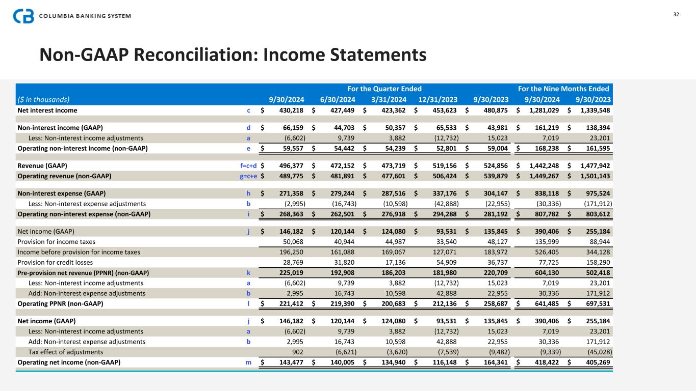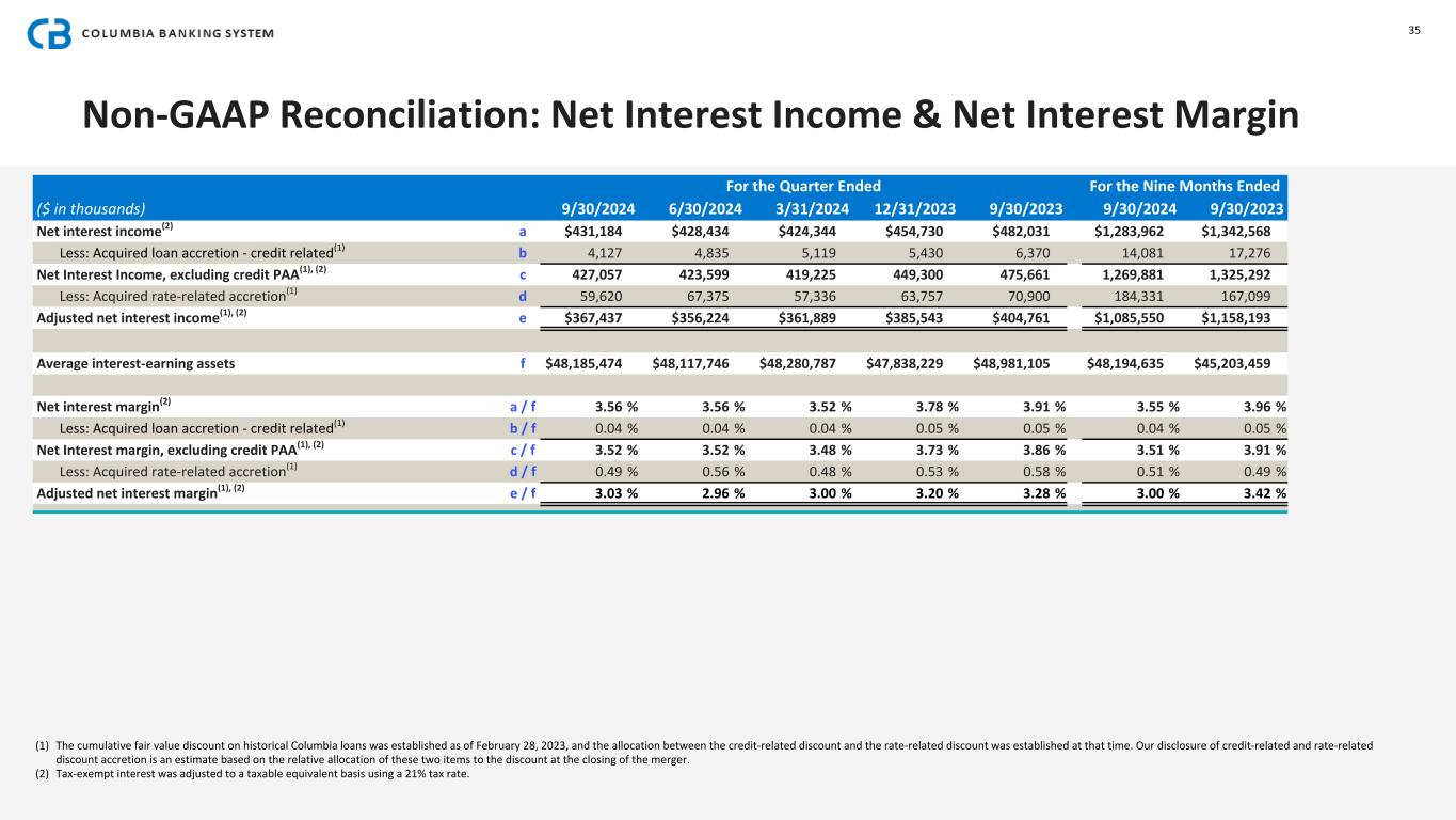 Non-GAAP对账:净利息收入&净息差(1)历史哥伦比亚贷款的累计公允价值贴现截至2023年2月28日建立,信贷相关贴现和利率相关贴现之间的分配当时建立。我们披露的信贷相关和利率相关的贴现增值是基于这两个项目在合并结束时对贴现的相对分配进行的估计。(二)免税利息按21%税率调整为等值计税基础。35截至九个月的季度(千美元)9/30/20246/30/20243/31/202412/31/20239/30/20239/30/20249/30/2023净利息收入(2)a $ 431184 $ 428,434 $ 424,344 $ 454,730 $ 482,031 $ 1,283,962 $ 1,342,568减:获得的贷款增值-信贷相关(1)b 4,1274,8355,1195,4306,37014,08117,276净利息收入,不包括信贷PAA(1),(2)c 427,057423,599419,225449,300475,6611,269,8811,325,292减:获得的利率相关增值(1)d 59,6(2)e $ 367,437 $ 356,224 $ 361,889 $ 385,543 $ 404,761 $ 1,085,550 $ 1,158,193平均生息资产f $ 48,185,474 $ 48,117,746 $ 48,280,787 $ 47,838,229 $ 48,981,105 $ 48,194,635 $ 45,203,459净息差(2)a/f 3.56% 3.56% 3.52% 3.78% 3.91% 3.55% 3.96%减:取得贷款增值-信贷相关(1)b/f 0.04% 0.04% 0.04% 0.05% 0.04% 0.05%净息差,不包括信贷PAA(1),(2)c/f 3.52% 3.52% 3.48% 3.73% 3.86% 3.51% 3.91%减:取得率相关增值(1)d/f 0.49% 0.56% 0.48% 0.53% 0.58% 0.51% 0.49%调整后净息差(1),(2)e/f 3.03% 2.96% 3.00% 3.20% 3.28% 3.00% 3.42%