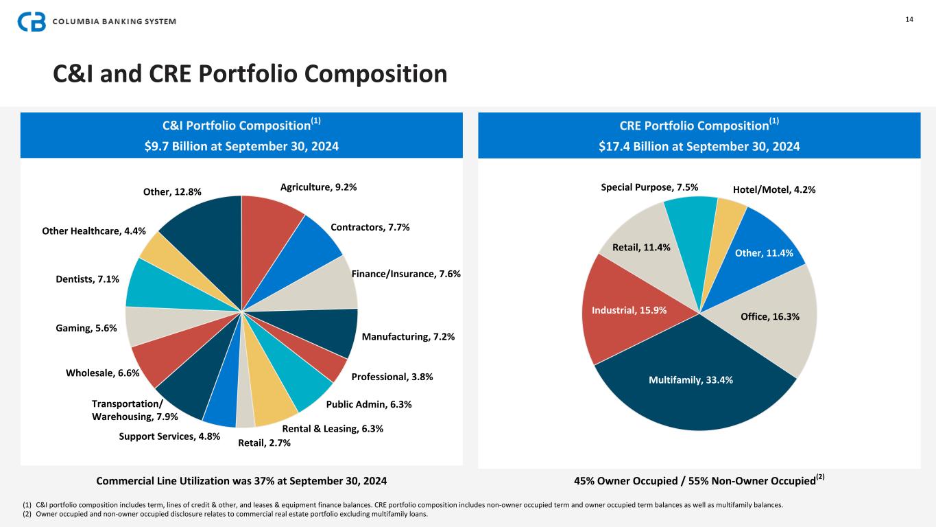 多元化、高质量的贷款和租赁组合注:截至2024年9月30日的投资组合统计数据和拖欠情况。2024年第三季度的年化净冲销率。贷款与价值(“LTV”)、FICO和偿债覆盖率(“DSC”)比率基于可获得数据的投资组合的加权平均值。LTV代表基于最新评估的平均LTV与更新的贷款余额。由于四舍五入,总数可能不够。•投资组合平均贷款规模为481,000美元• 2024年第三季度平均贷款规模为326,000美元•投资组合平均FICO为761,LTV为62% • 2024年第三季度平均FICO为761,LTV为66% •总拖欠率为1.18% •年化净冲销(回收)率为0.05%非业主占用CRE •投资组合平均贷款规模为170万美元• 24年第三季度平均贷款规模为280万美元•投资组合平均LTV为51%,DSC为1.89 • 24年第三季度平均LTV为54%和DSC为1.94 •总拖欠率为0.10% •年化净冲销(回收)率为0.000%商业和工业•投资组合平均贷款规模为714,000美元• 2024年第三季度平均贷款规模为872,000美元•总拖欠率为0.57% •年化净冲销(回收)率为0.37%多户家庭•投资组合平均贷款规模为230万美元• 2024年第三季度平均贷款规模为897,000美元•投资组合平均LTV为54%,DSC为1.57 • 2024年第三季度平均LTV为66%和DSC为1.59 •总拖欠率为0.000% •年化净冲销(回收)率为0.000%所有者占用CRE •投资组合平均贷款规模为100万美元• 3Q24平均贷款规模为140万美元•投资组合平均LTV为55% • 3Q24平均LTV为59% •总拖欠率为0.64% •年化净冲销(回收)率为0.0000%租赁和设备融资(FinPAC)•投资组合平均贷款和租赁规模为4.2万美元• 3Q24平均贷款和租赁规模为5.5万美元•投资组合平均收益率:~10% •总拖欠率为3.57% •年化净冲销(回收)率4.76%普吉特海湾、20%西澳其他、8%波特兰地铁、13%或其他、14%湾区、7%北部加利福尼亚州、9%南部加利福尼亚州、15%其他、14%抵押贷款、16% FinPAC、4% C & I、23%业主自住CRE、14%非OO CRE、17%多户家庭、15%其他贷款类别、13% 2024年9月30日投资组合构成2024年9月30日地理分布抵押贷款13