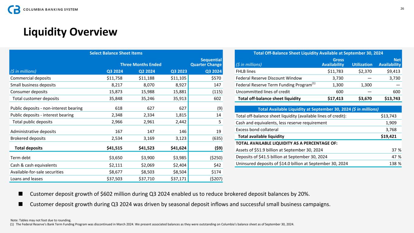 流动性概览2024年9月30日可用流动性总额(百万美元)表外流动性总额(可用信贷额度):13743美元现金及等价物,减准备金要求1909超额债券抵押品3768可用流动性总额19421美元可用流动性总额百分比:2024年9月30日资产519亿美元37% 2024年9月30日存款415亿美元47% 2024年9月30日无保险存款140亿美元138% 9月30日可用表外流动性总额,2024年(百万美元)总可用性利用率净可用性FHLB额度$ 11,783 $ 2,370 $ 9,413美联储贴现窗口3,730 — 3,730美联储定期资金计划(1)1,3001,300 —未承诺信贷额度600—600表外流动性总额$ 17,413 $ 3,670 $ 13,74326 ■ 2024年第三季度客户存款增长6.02亿美元,使我们能够将经纪存款余额减少20%。■ 2024年第三季度的客户存款增长是由季节性存款流入和成功的小企业活动推动的。选择资产负债表项目三个月结束连续季度变化(百万美元)2024年第三季度2024年第二季度2023年第三季度2024年第三季度商业存款11,758美元11,188美元11,105美元570美元小企业存款8,2178,0708,927147消费者存款15,87315,98815,881(115)客户存款总额35,84835,24635,913602公众存款-不计息618627627(9)公众存款-计息2,3482,3341,81514公众存款总额2,9662,9612,4425行政存款16714714619经纪存款2,5343,1693,123(635)存款总额41,515美元41,523美元41,624美元(9美元)定期债务3,650美元3,900美元3,9等值2,111美元2,069美元2,404美元42美元可供出售证券8,677美元8,503美元8,504美元174美元贷款和租赁37,503美元37,710美元37,171美元(207美元)注:由于四舍五入,表格可能不符合规定。(1)美联储的银行定期融资计划于2024年3月终止。我们在截至2024年9月30日的哥伦比亚资产负债表上列报相关余额,因为它们是未偿还的。