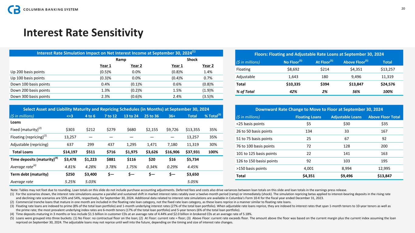选择9月30日资产负债到期和重新定价时间表(以月为单位),2024年(百万美元)< = 34至67至1213至2425至3636 +合计%总额(3)贷款固定(到期)(2)303美元212美元279美元680美元2,155美元9,726美元13,35535%浮动(重新定价)(2)13,257 ———— 13,25735%可调整(重新定价)6372994371,2951,4717,18011,31930%贷款总额14,197美元511美元716美元1,975美元3,626美元16,906美元37,931100%定期存款(到期)(4)3,478美元1,223美元881美元116美元20美元16美元5,734平均利率(4)4.81% 4.28% 3.78% 1.75% 0.34% 0.29% 4.45%定期债务(到期)$ 250 $ 3,400 $ —注意:由于四舍五入,表格可能不够用。这张幻灯片上的贷款总额不包括采购会计调整。递延费用和成本也导致了这张幻灯片上的贷款总额与收益新闻稿中的贷款总额之间的差异。(1)对于所示的情景,利率模拟假设市场利率在12个月期间(斜坡)或立即(冲击)内平行且持续地按比例移动。2024年9月30日在利率上升和利率下降情景下应用于计息存款的模拟重定价贝塔系数分别为55%和54%。有关利率模拟的更多数据可在哥伦比亚截至2023年12月31日的财政年度的10-K表格中获得。(2)一个月内到期的商业部分贷款被纳入浮动利率贷款类别,而不是固定利率贷款类别,因为这些贷款以类似浮动利率贷款的方式重新定价。(3)浮动利率贷款与prime(占总贷款组合的8%)和1个月基础利率(占总贷款组合的27%)挂钩。当可调整利率贷款重新定价时,它们与跨越1个月期至10年期的利率以及最优惠利率挂钩;最普遍的基础指数利率是6个月期(占总贷款组合的17%)和5年期(占总贷款组合的6%)。(4)3个月及以下到期的定期存款包括平均利率为4.44%的15亿美元客户CD和平均利率为5.18%的20亿美元经纪CD。(5)贷款分为三大类:(1)无下限:贷款无合同下限;(2)在下限:当前利率=下限;(3)在下限:当前利率超过下限。高于下限的金额是基于当前保证金加上当前指数,假设贷款在2024年9月30日重新定价。可调整贷款可能要到很长一段时间才会重新定价,这取决于利率变化的时间和规模。利率模拟对2024年9月30日净利息收入的影响(1)斜坡冲击年份1年2年1年2上升200个基点(0.5)% 0.0%(0.8)% 1.4%上升100个基点(0.3)% 0.0%(0.4)% 0.7%下降100个基点0.4%(0.1)% 0.6%(0.8)%下降200个基点1.3%(0.2)% 1.5%(1.9)%下降300个基点2.3%(0.6)% 2.4%(3.5)%下行利率变动至9月30日的下限,2024年(百万美元)浮动贷款可调整最低贷款总额< 25个基点5美元30美元3526至50个基点1343316751至75个基点25679276至100个基点72128200101至125个基点22141163126至150个基点92103195 > 150个基点4,0018,99412,995美元总计4,351美元9,496美元13,847美元最低:截至9月30日的浮动和可调整利率贷款,2024(百万美元)无楼层(5)在楼层(5)以上楼层(5)合计浮动$ 8,692 $ 214 $ 4,351 $ 13,257可调整1,6431809,49611,319合计$ 10,335 $ 394 $ 13,847 $ 24,576%合计42% 2% 56% 100%