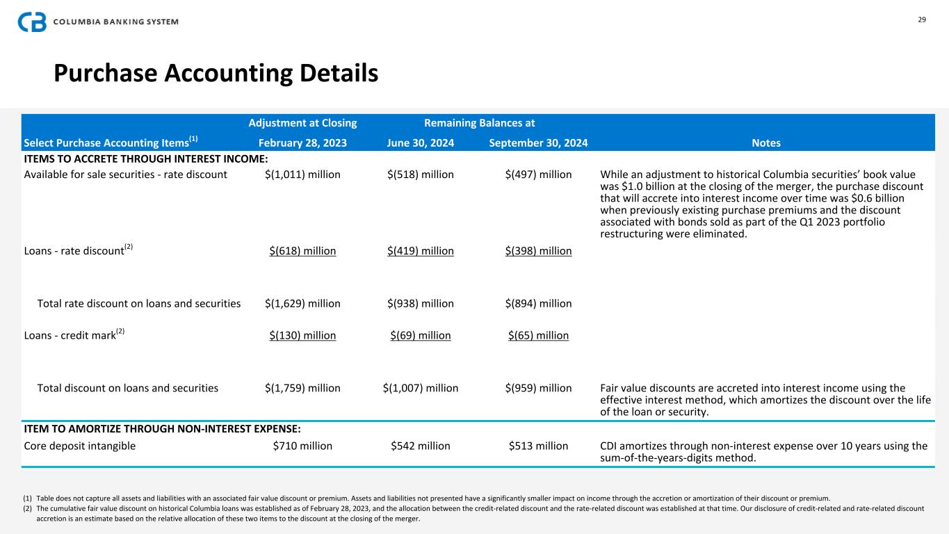 采购会计明细(1)表并未涵盖所有具有相关公允价值折让或溢价的资产和负债。未列报的资产和负债通过其折价或溢价的增值或摊销对收入的影响要小得多。(2)历史哥伦比亚贷款的累计公允价值贴现截至2023年2月28日成立,信贷相关贴现和利率相关贴现之间的分配当时成立。我们披露的信贷相关和利率相关的贴现增值是基于这两个项目在合并结束时对贴现的相对分配进行的估计。选择购买会计项目期末剩余余额的调整(1)2023年2月28日2024年6月30日2024年9月30日通过利息收入应计的票据项目:可供出售证券-利率折扣$(1,011)百万$(518)百万$(4.97)百万虽然在合并结束时对历史哥伦比亚证券的账面价值进行了调整为10亿美元,但当先前存在的购买溢价和与作为2023年第一季度投资组合重组的一部分而出售的债券相关的折扣被消除时,随着时间的推移将增加为利息收入的购买折扣为6亿美元。贷款-利率折扣(2)$(618)百万$(419)百万$(398)百万贷款和证券总利率折扣$(1,629)百万$(938)百万$(894)百万贷款-信用标记(2)$(130)百万$(69)百万$(65)百万贷款和证券总折扣$(1,759)百万$(1,007)百万$(959)百万公允价值折扣采用实际利率法计入利息收入,在贷款或证券的存续期内摊销折扣。通过非利息费用摊销的项目:核心存款无形资产7.1亿美元5.42亿美元CDI使用年数加总法通过非利息费用在10年内摊销。29