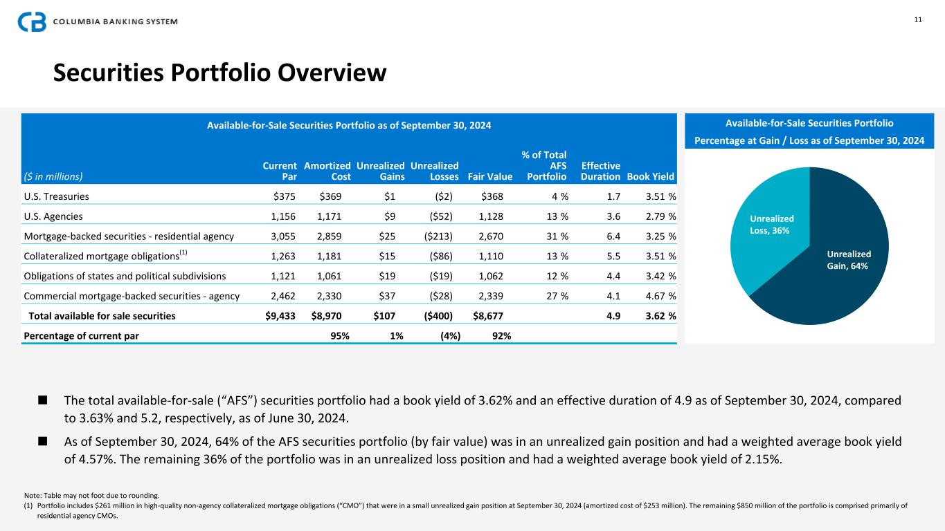 截至9月30日可供出售证券组合,2024年(百万美元)当前面值摊销成本未实现收益未实现损失公允价值占AFS投资组合总有效期限账面收益率的百分比美国国债375美元369美元1美元(2美元)3684% 1.7 3.51%美国机构1,1561,171美元9美元(52美元)1,12813% 3.6 2.79%抵押贷款支持证券-住宅机构3,0552,859美元25美元(213美元)2,67031% 6.4 3.25%抵押贷款债务(1)1,2631,181美元15美元(86美元)1,11013% 5.5 3.51%各州债务和政治部门1,1211,061 $ 19($ 19)1,06212% 4.4 3.42%商业抵押贷款支持证券-机构2,4622,330 $ 37($ 28)2,33927% 4.14.67%可供出售证券总额$ 9,433 $ 8,970 $ 107($ 400)$ 8,6774.9 3.62%当前面值的百分比95% 1%(4%)92% 11证券投资组合概览注:由于四舍五入,表格可能不符合规定。(1)投资组合包括2.61亿美元的高质量非机构抵押抵押债务(“CMO”),这些债务在2024年9月30日处于小幅未实现收益状态(摊销成本为2.53亿美元)。投资组合中剩余的8.5亿美元主要由住宅代理CMO组成。■截至2024年9月30日,总可供出售(“AFS”)证券组合的账面收益率为3.62%,有效存续期为4.9,而截至2024年6月30日,账面收益率分别为3.63%和5.2。■截至2024年9月30日,64%的AFS证券组合(按公允价值计算)处于未实现收益头寸,加权平均账面收益率为4.57%。剩余36%的投资组合处于未变现亏损状态,加权平均账面收益率为2.15%。截至2024年9月30日未实现收益、64%未实现亏损、36%可供出售证券组合收益/亏损百分比